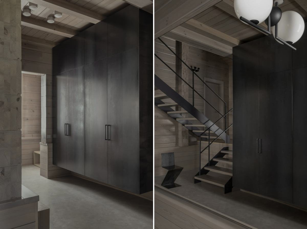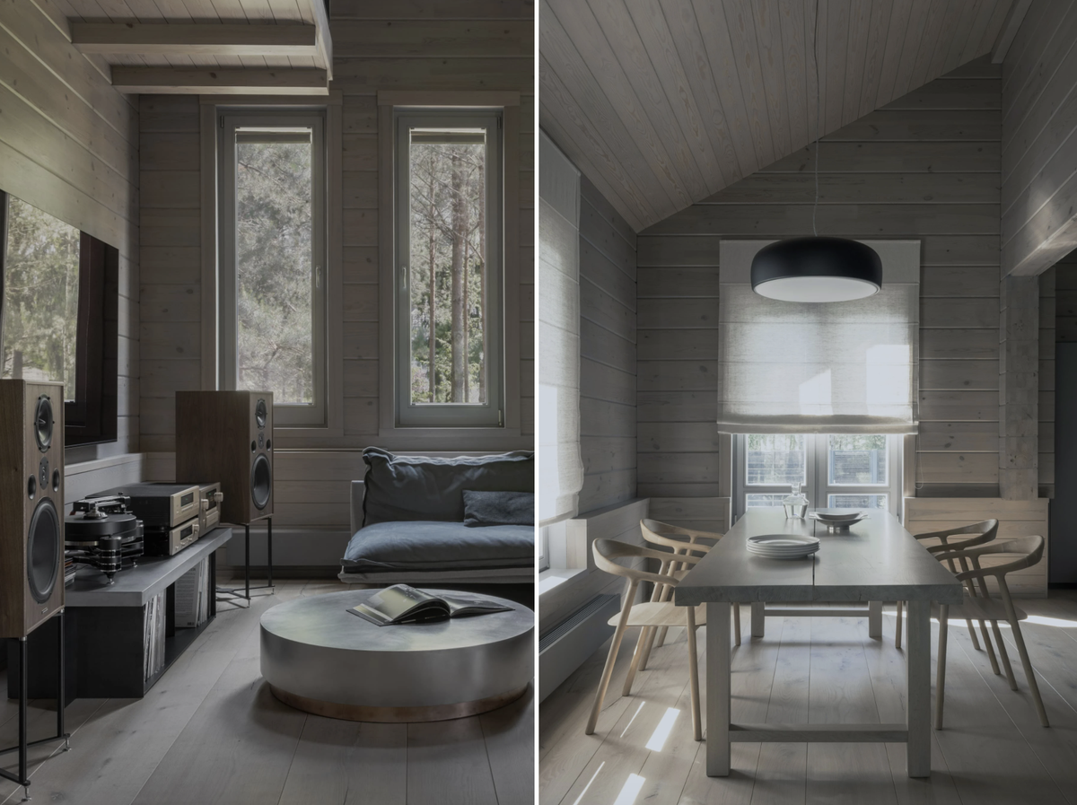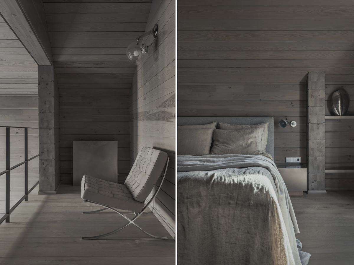 В отделке ставка делалась на натуральность: брус, покрытый маслом, широкий массив дуба с живыми сучками, натуральный известняк и матовый металл. В комнатах смешались серые оттенки, деревянные фактуры и камень.