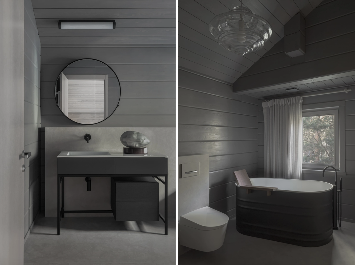 При разработке интерьера дизайнер взял за основу два обстоятельства: вид на густой лес и серые монохромные фасады дома. Здесь еще до ремонта ощущалась медитативная тишина, поэтому ее было решено продолжить в интерьере.
