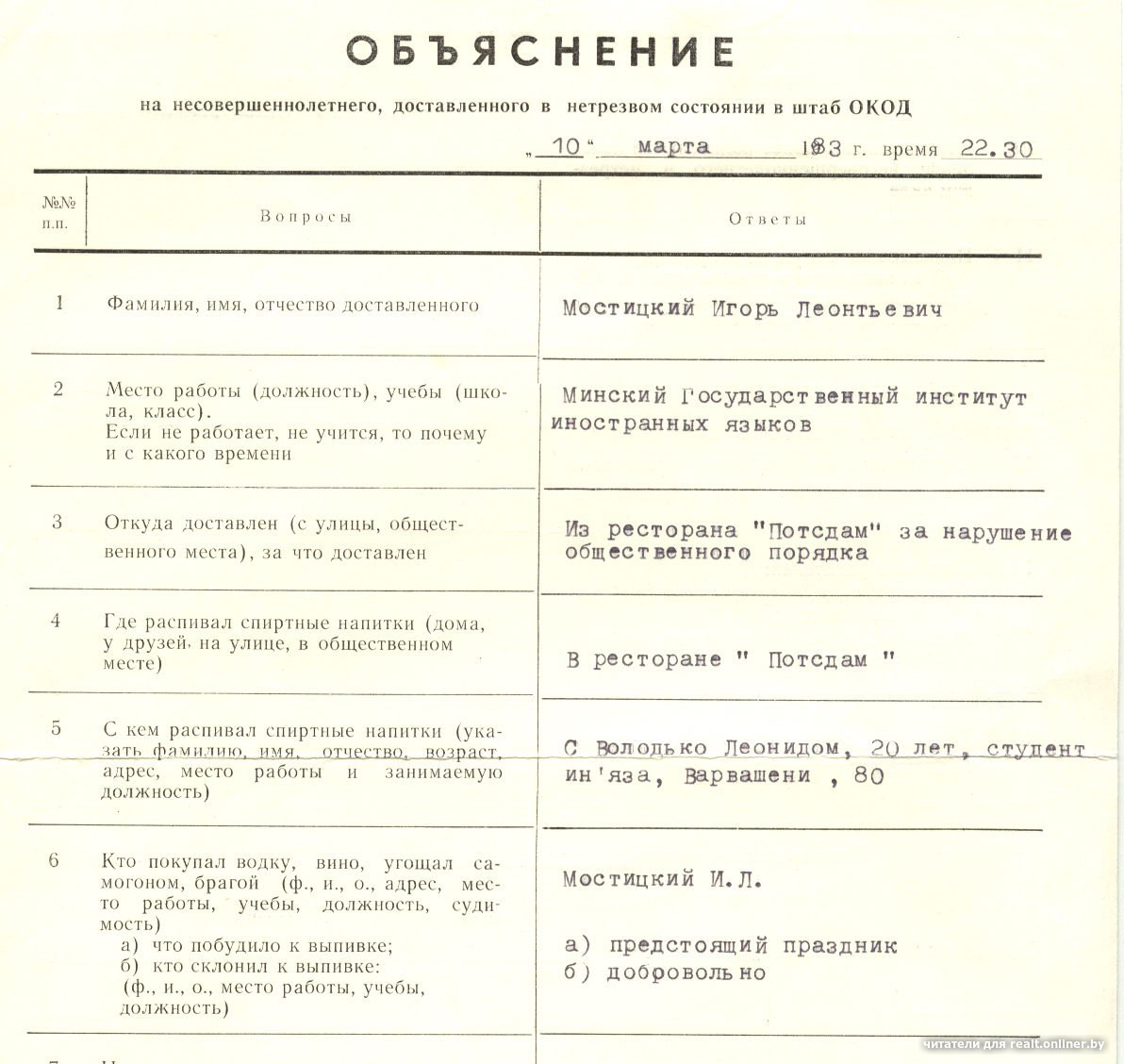 Игорь вспоминает, как однажды в шутку заполнил на себя и на друга протокол. Молодым, как бывает во все времена, хотелось подурачиться. Обратите внимание: парней якобы доставили в милицию из ресторана «Потсдам». Это примечательный момент для знатоков минского советского общепита.