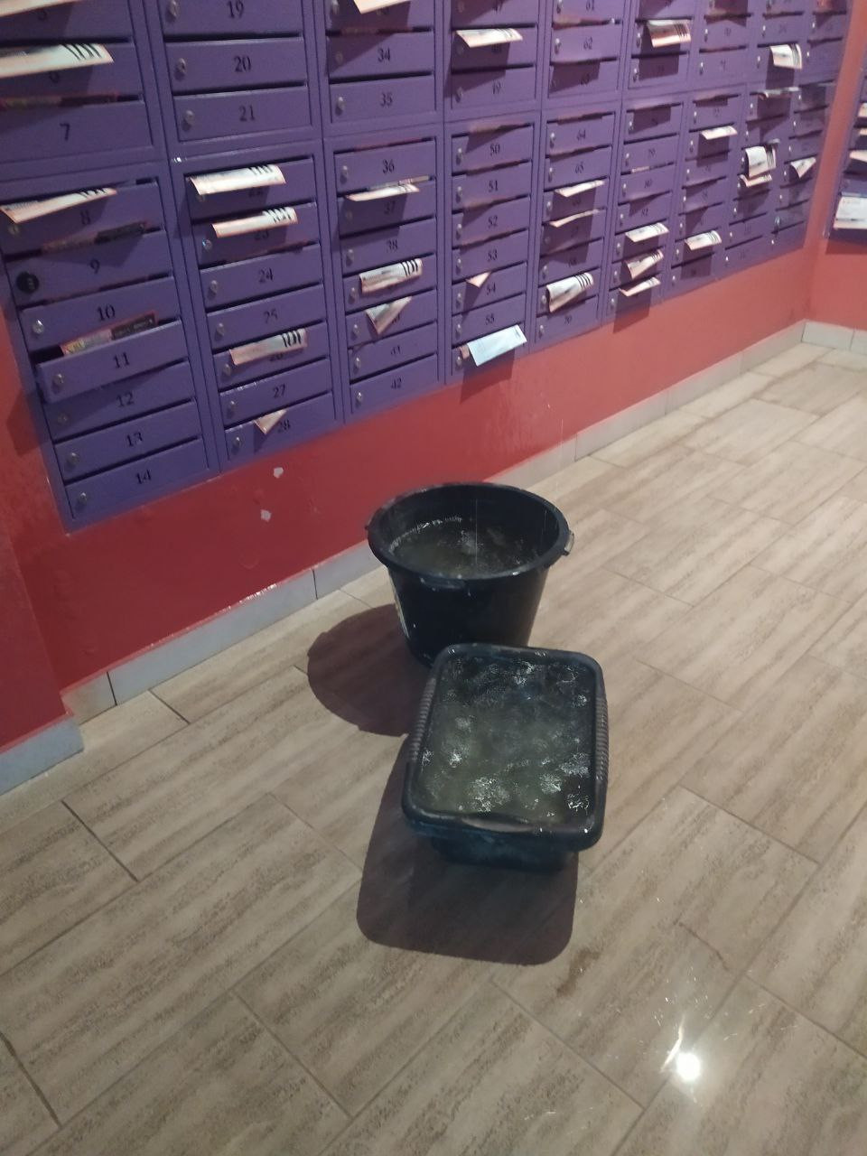 На фото, присланных в редакцию, видно, как вода льется прямо из распределительного шкафа под высоким напряжением, стекая по стене. На полу — лужи, ведра и тазики, которыми жильцы пытаются собрать воду. В лобби и у почтовых ящиков — мокрые следы и капли с потолка.