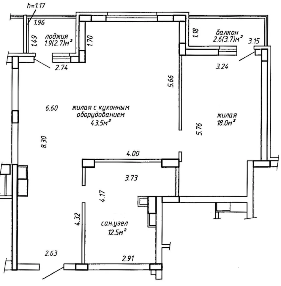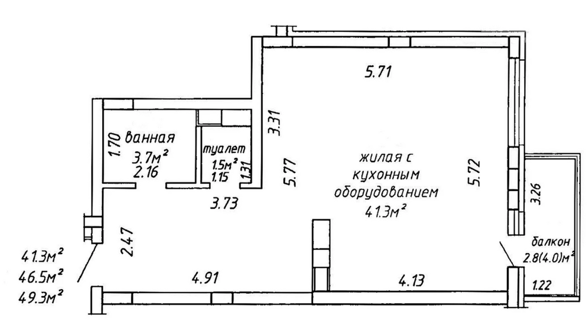 1-комнатная квартира здесь довольно просторная — 49,3 метра. В то время еще не было принято заполнять новостройки малогабаритками. Планировка в ней свободная. Стоимость — $108 460.