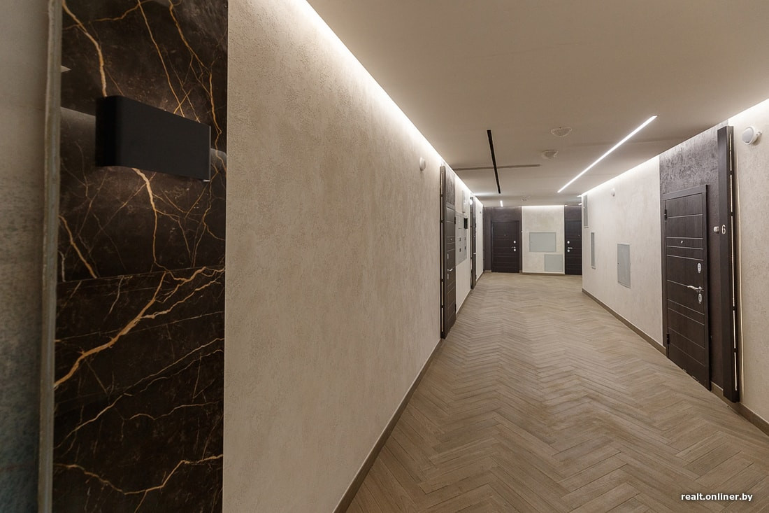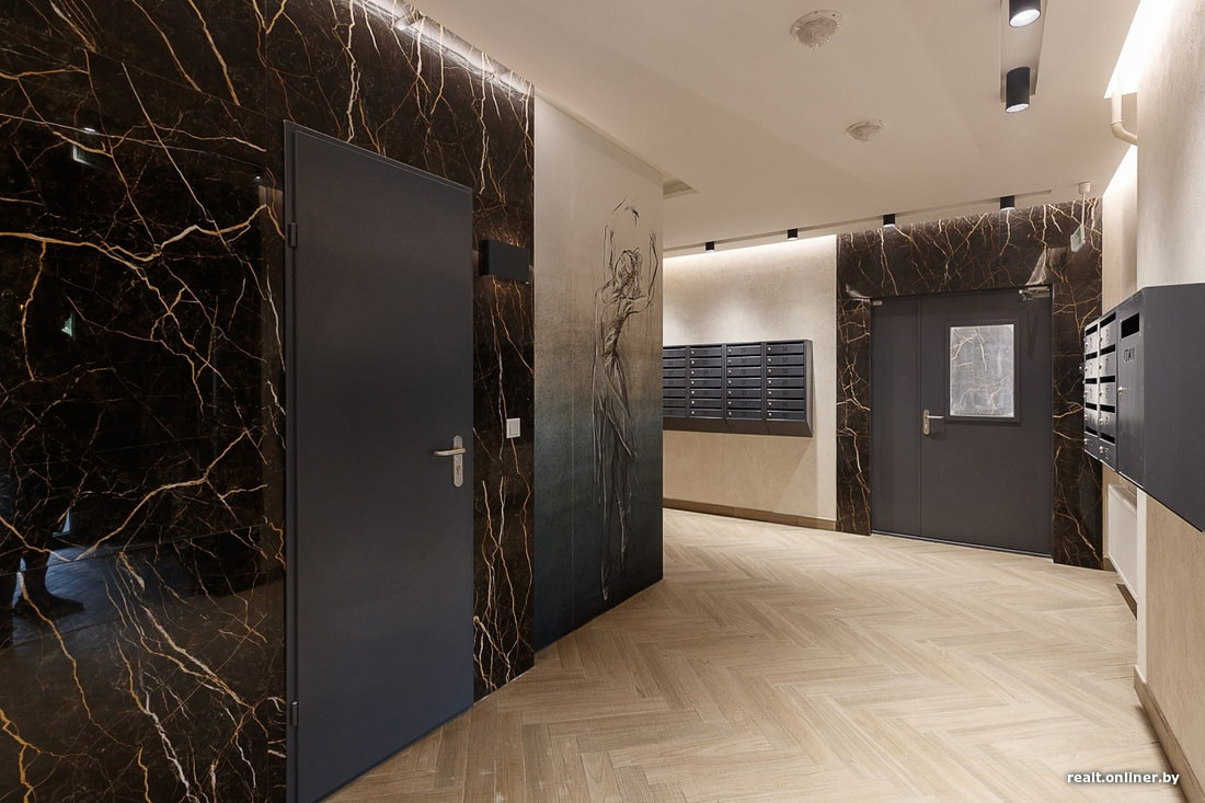 Отделку мест общего пользования постарались сделать под стать премиальному званию. Холл на первом этаже отделан керамической плиткой под мрамор, имеется интересная подсветка потолка и декоративные панели с подсветкой номеров квартир.