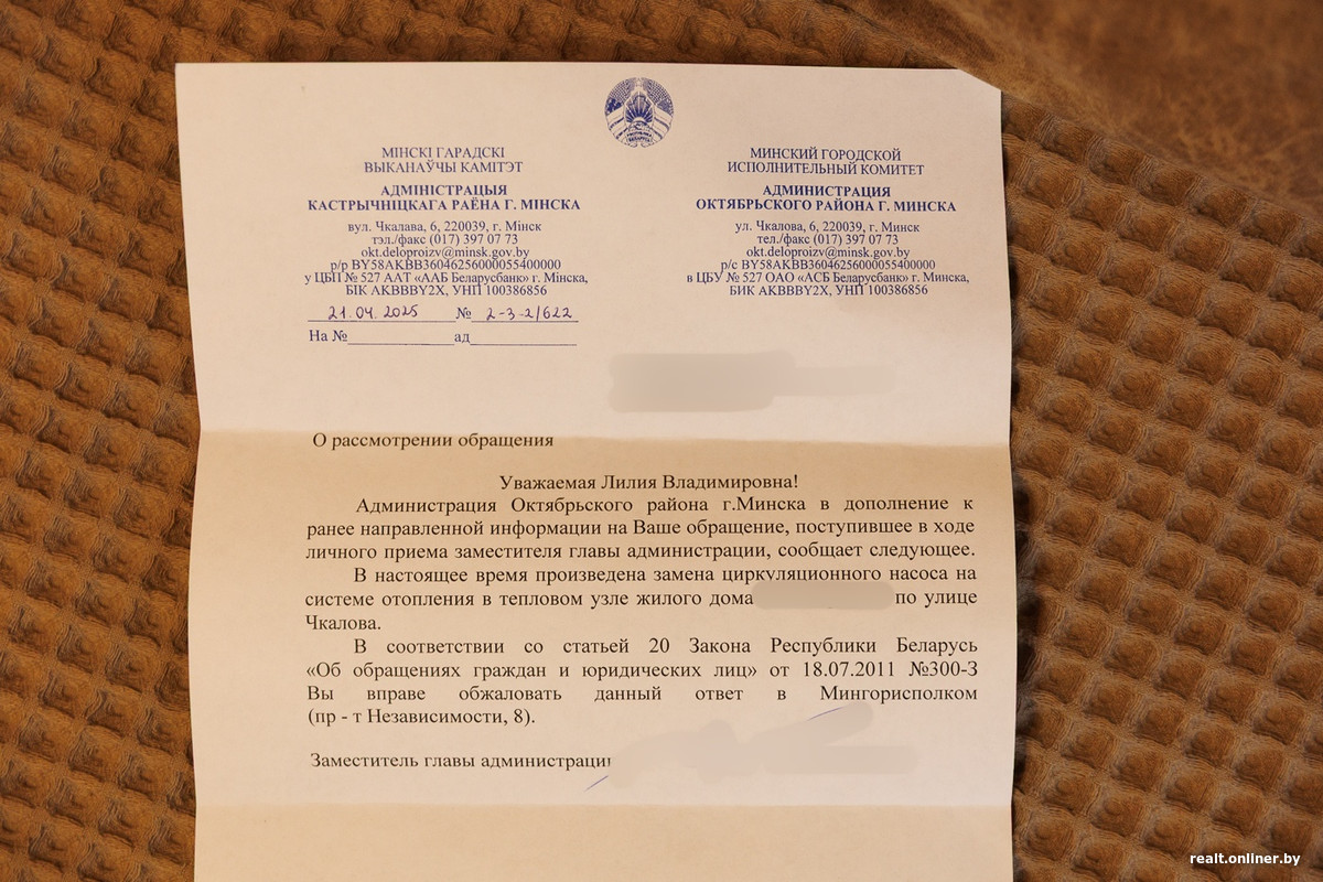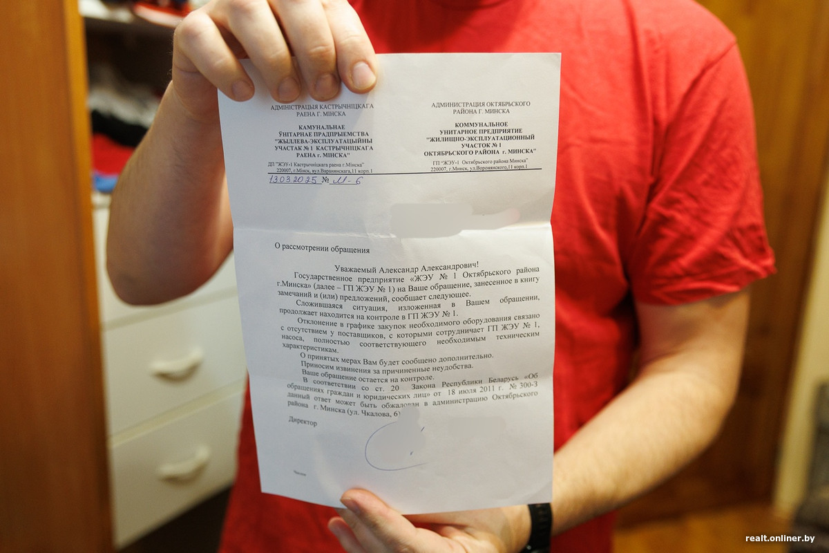 Так продолжалось до весны 2025 года. Белорус не выдержал и отправился в ЖЭУ лично, где оставил замечание в книге жалоб и предложений. Вскоре оттуда пришел ответ — надо сказать, вполне оптимистичный. Проблему признали, но все еще не решили, так как не смогли приобрести новый насос.