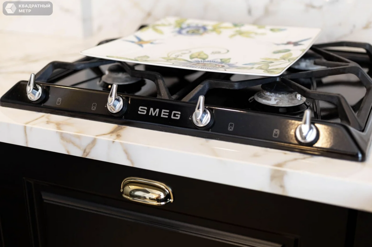 Много антикварных вещей: картины, комод конца XVIII века, кресла, ковры… Оригинальные картины и другие дизайнерские атрибуты интерьера. Кухонная техника Smeg.