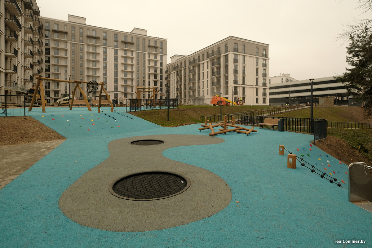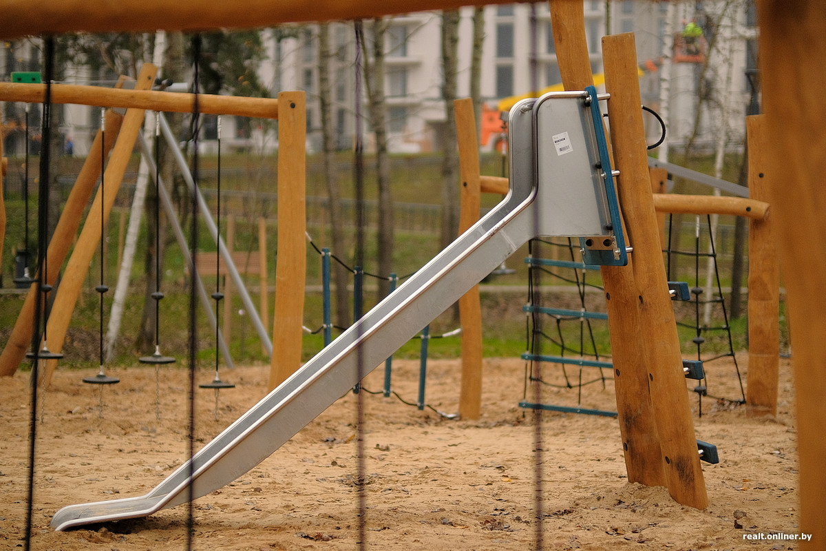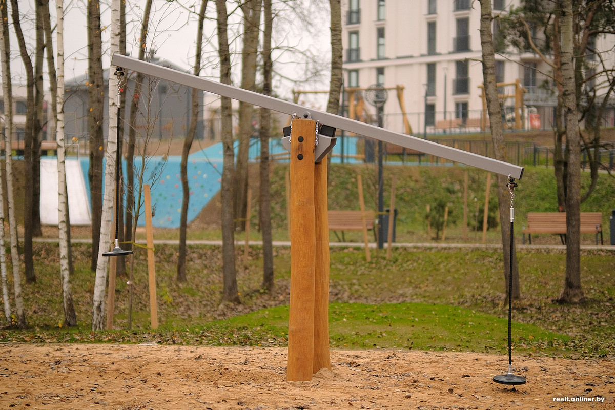 На территории обустроены лестницы, пандусы, дорожки, освещение, зоны отдыха и несколько игровых площадок. В центральной зоне установили канатную дорогу, лазалки, широкую горку и батуты. Все оборудование выполнено в экостиле из массива робинии.