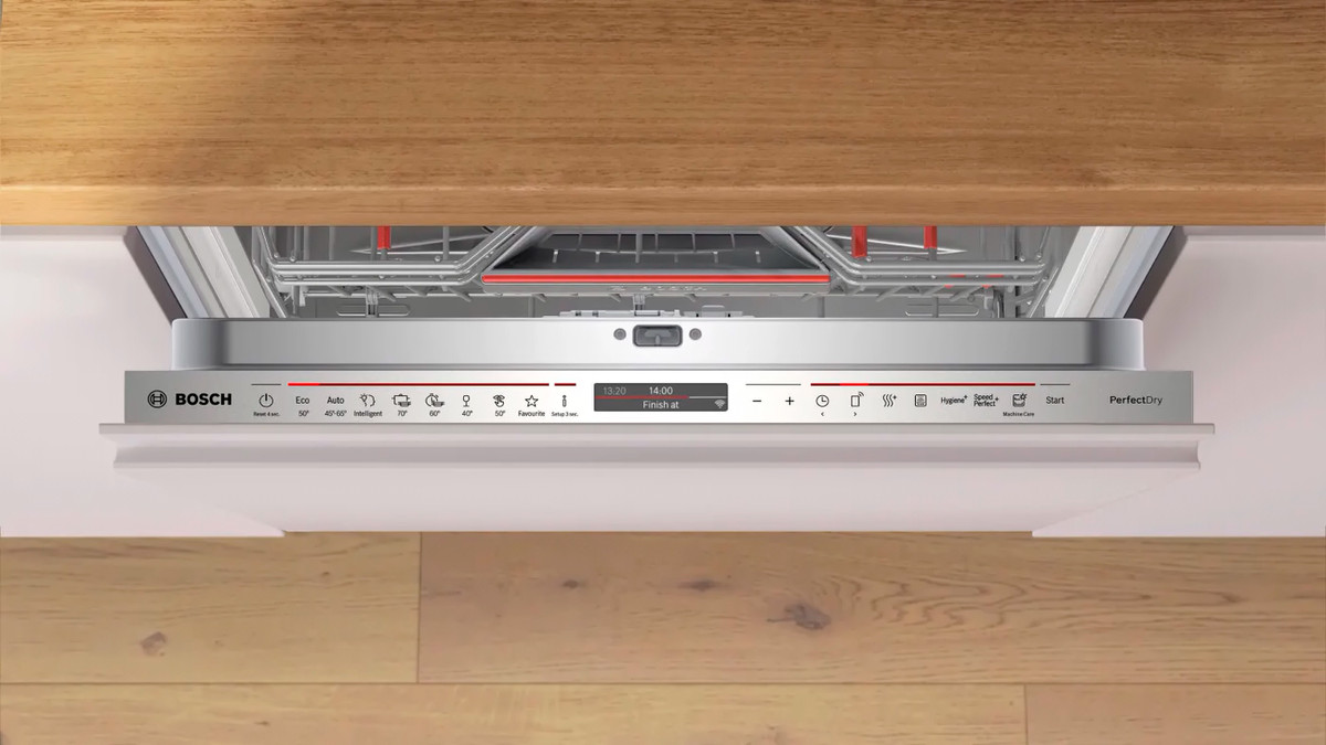 Самая дорогая модель рейтинга — при этом настоящий флагман. Помимо инверторного мотора — продвинутая сушка: теплообменник, открывание дверцы и Zeolite. 8 программ и полный пакет опций: дополнительная сушка, ускоренная и гигиеническая мойка, усиление в нижней корзине, самоочистка. Сенсорное управление с цветным ЖК-экраном и его проекцией на пол. Вишенка на торте — внутренняя подсветка камеры посудомойки.