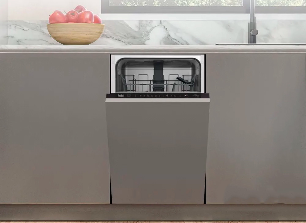 Самая бюджетная модель нашего рейтинга — узкая посудомоечная машина с половинной загрузкой и 5 программами, чего вполне достаточно для выполнения базовых задач. Простая и понятная панель управления со светодиодной индикацией — отличный вариант для небольших семей.