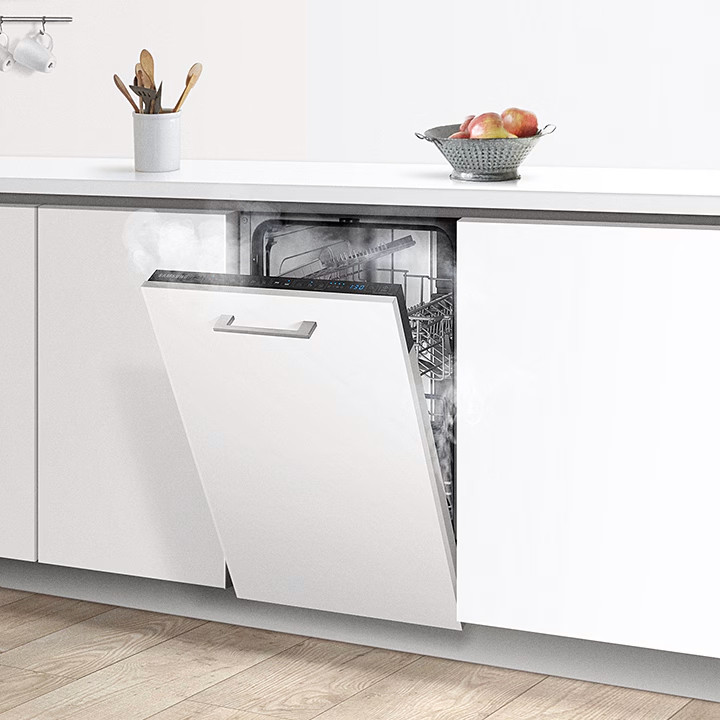Посудомоечная машина рассчитана на десять комплектов посуды — оптимальный объем, которого вполне хватает даже после семейных застолий. При этом узкий формат становится плюсом в повседневном использовании: меньше грязной посуды скапливается в ожидании запуска. В арсенале — шесть программ, включая автоматическую, интенсивную, экономичную, ночную и пользовательскую, а также сушка с теплообменником и режимом ExtraDry. Инверторный мотор обеспечивает тихую и надежную работу, а удобная индикация на полу подскажет, когда цикл завершен.