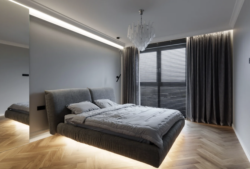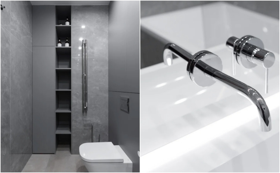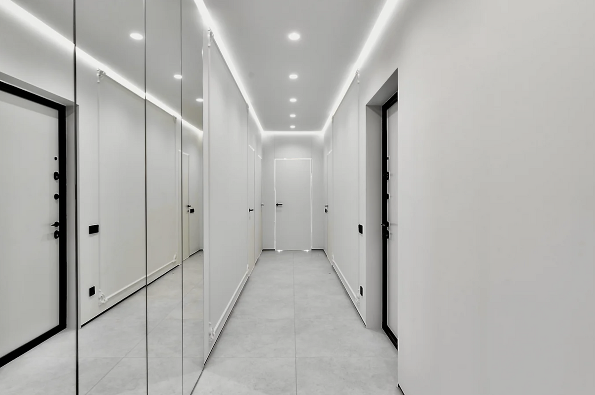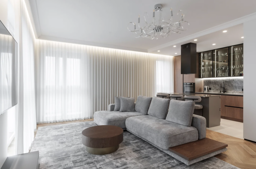 Ее площадь — 93 квадратных метра, которые грамотно разделили на две отдельные комнаты на 17 и 16 метров, а также просторную гостиную, совмещенную с кухней. Нашлось здесь место и для гардеробной.