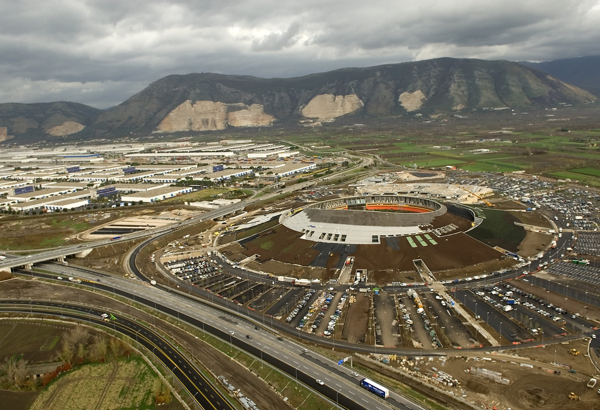 Этот крупнейший на юге Италии оператор грузового порта и складских площадей располагал большим количеством свободной земли по соседству со своим основным логистическим комплексом у городка Нола в предместьях Неаполя. Менеджмент компании решил диверсифицировать свой бизнес и заняться еще и ретейлом, тем более что этому району как раз не хватало большого современного молла, где можно было бы провести целый день. На расходах инвестор решил не мелочиться и обратился в бюро Ренцо Пиано, самого известного итальянского архитектора. Предварительная стадия проектирования и согласование всех нужных документов растянулась на долгие семь лет. В том числе и из-за того, что автор решил не ограничиваться привычной для торгового жанра формой гигантского ангара, а предложил инженерно сложный, но эффектный художественный образ.