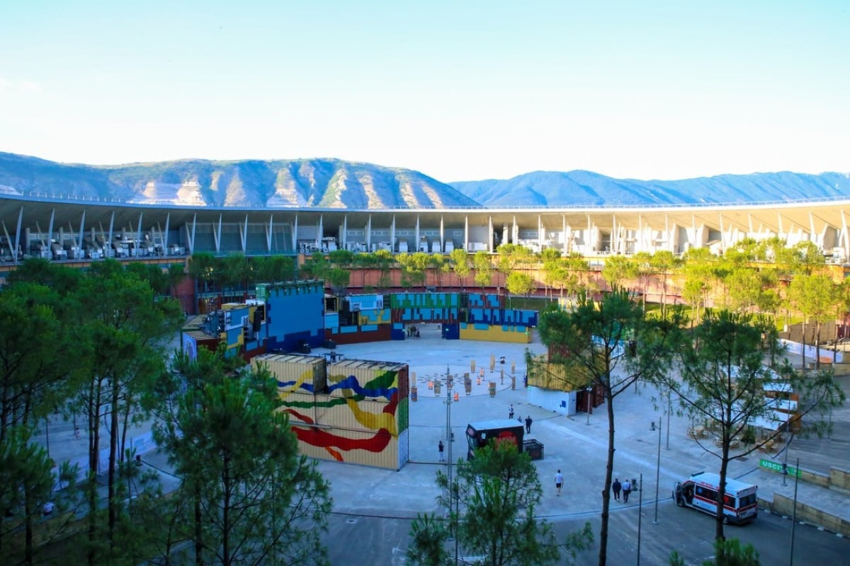 Снаружи, если не считать пятерки входных проемов, здание практически не считывается как архитектурное сооружение, поскольку железобетонная кровля покрыта землей, травой и кустарниками, скрывающими конструкцию. В общей сложности на крыше высажено 2,5 тысячи различных растений, которые помогают изолировать внутренние помещения и уменьшают визуальную нагрузку. Искусственная природа переплетается с естественной в игре «Ложное и настоящее». Кровля прорезана световыми фонарями, дающими интерьеру естественное освещение. Установленные солнечные батареи обеспечивают питанием освещение искусственное.