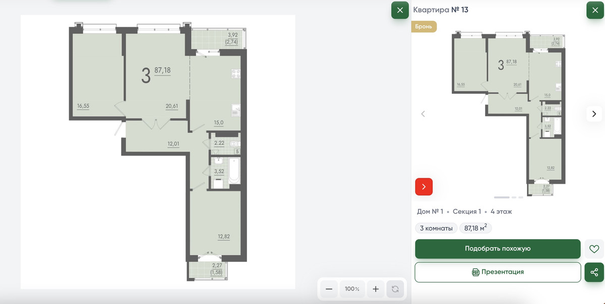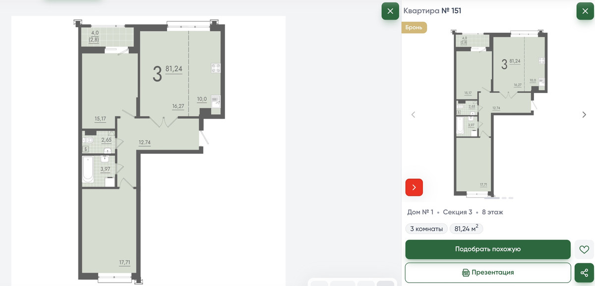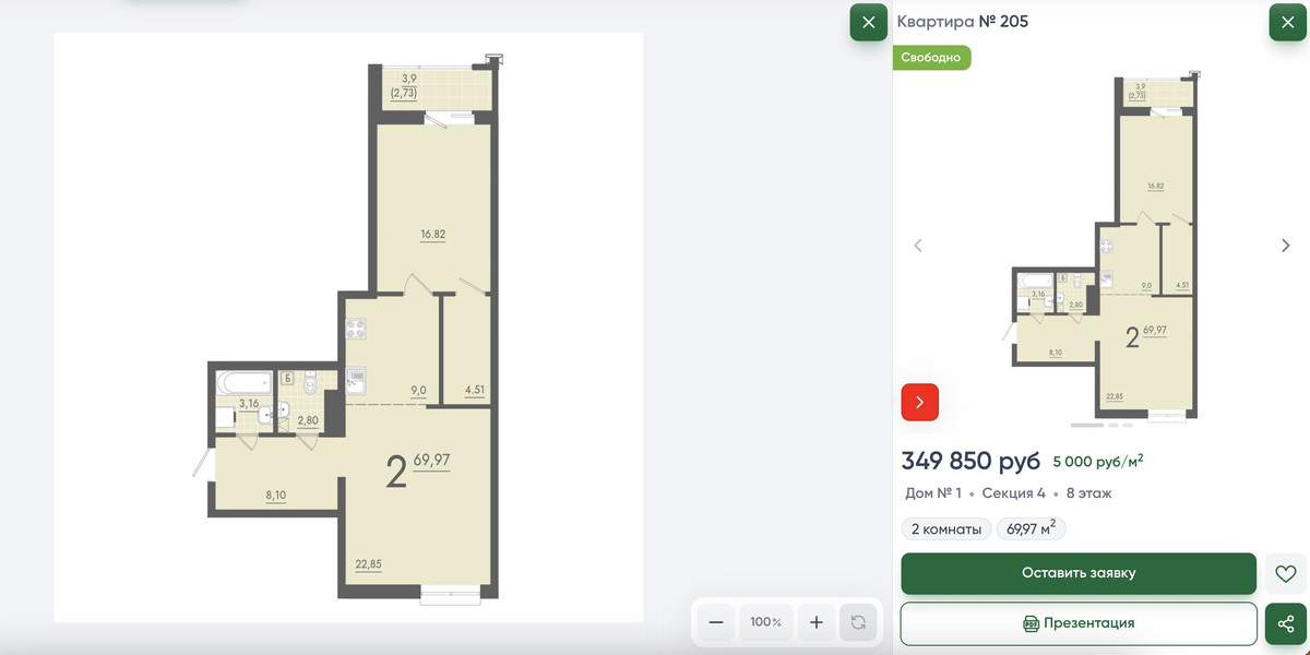 Стоимость метра для двушек — 5000—5050 рублей (одна из них уже забронирована). «Квадрат» в трешках обойдется дешевле — 4300—4600 рублей (все они на текущий момент забронированы, если верить шахматке, но надежду не стоит терять).