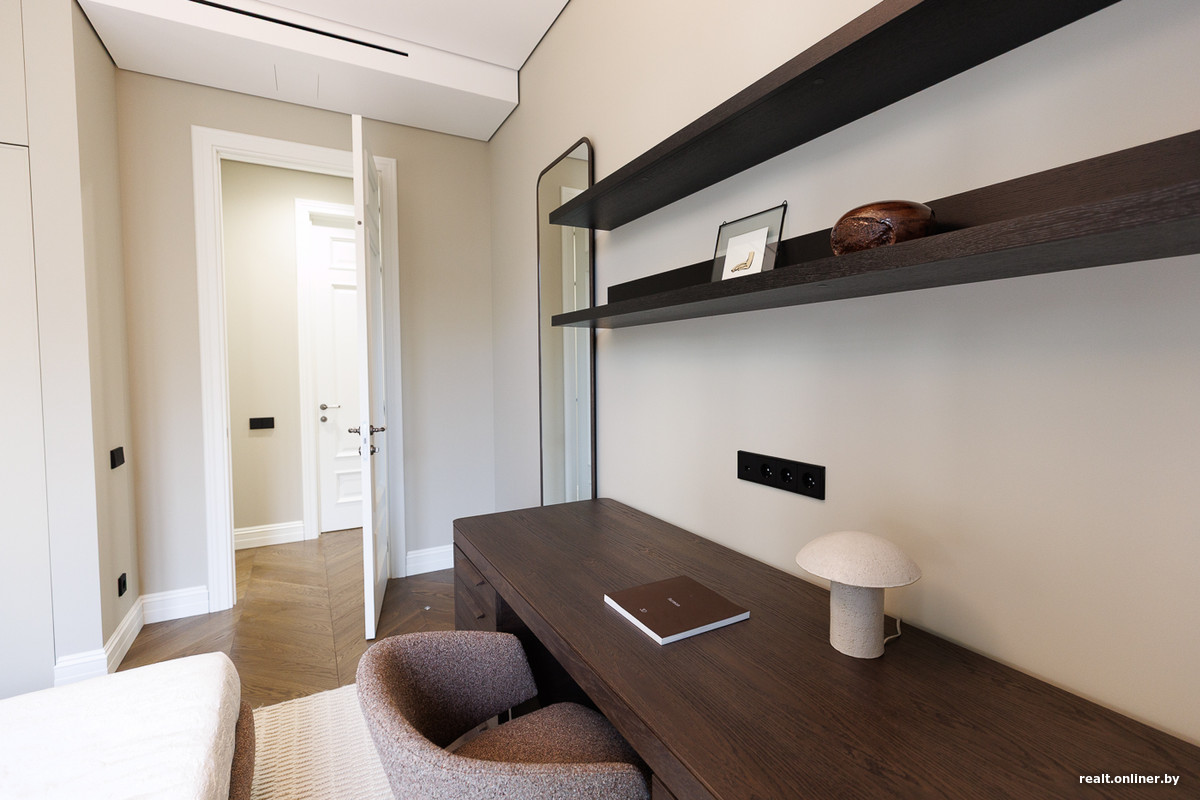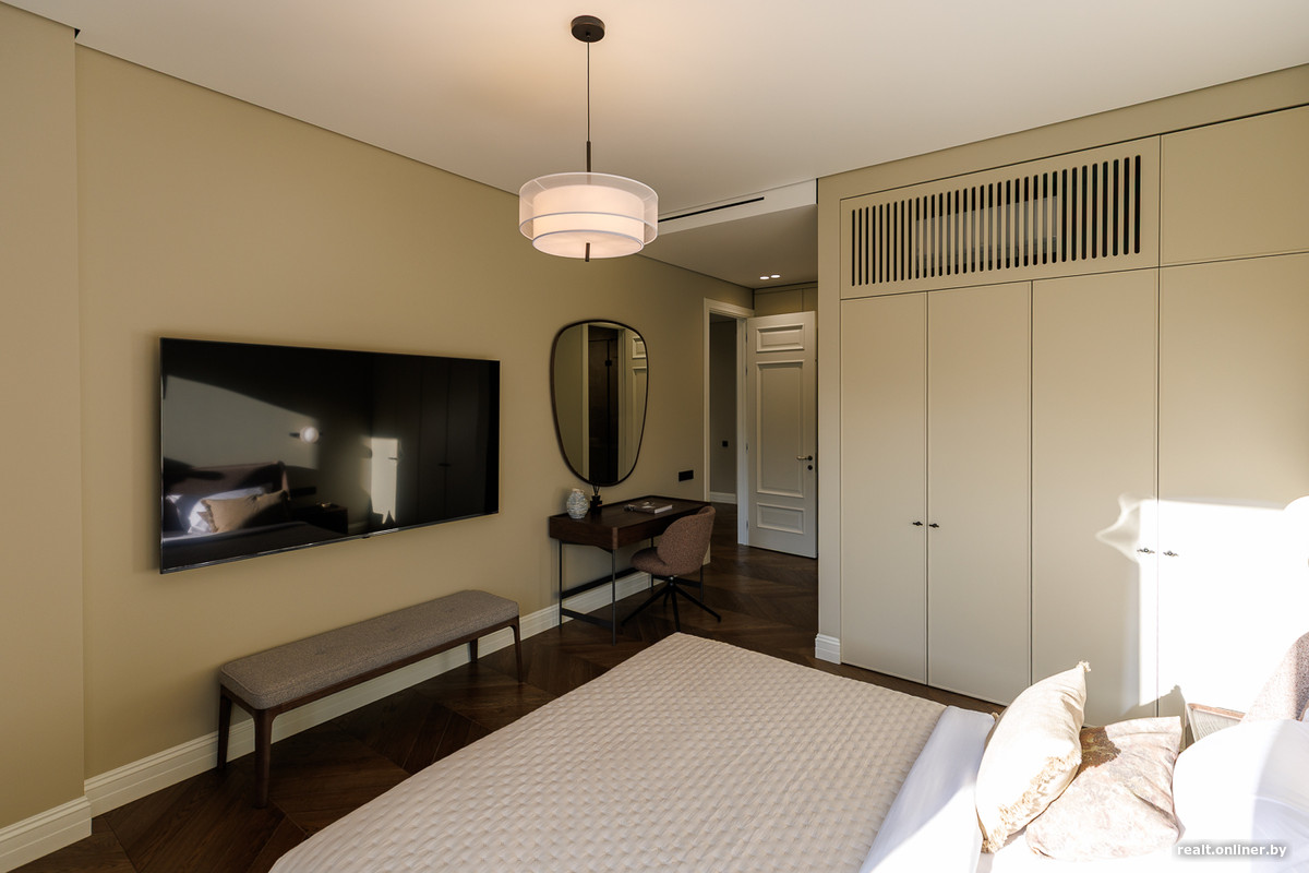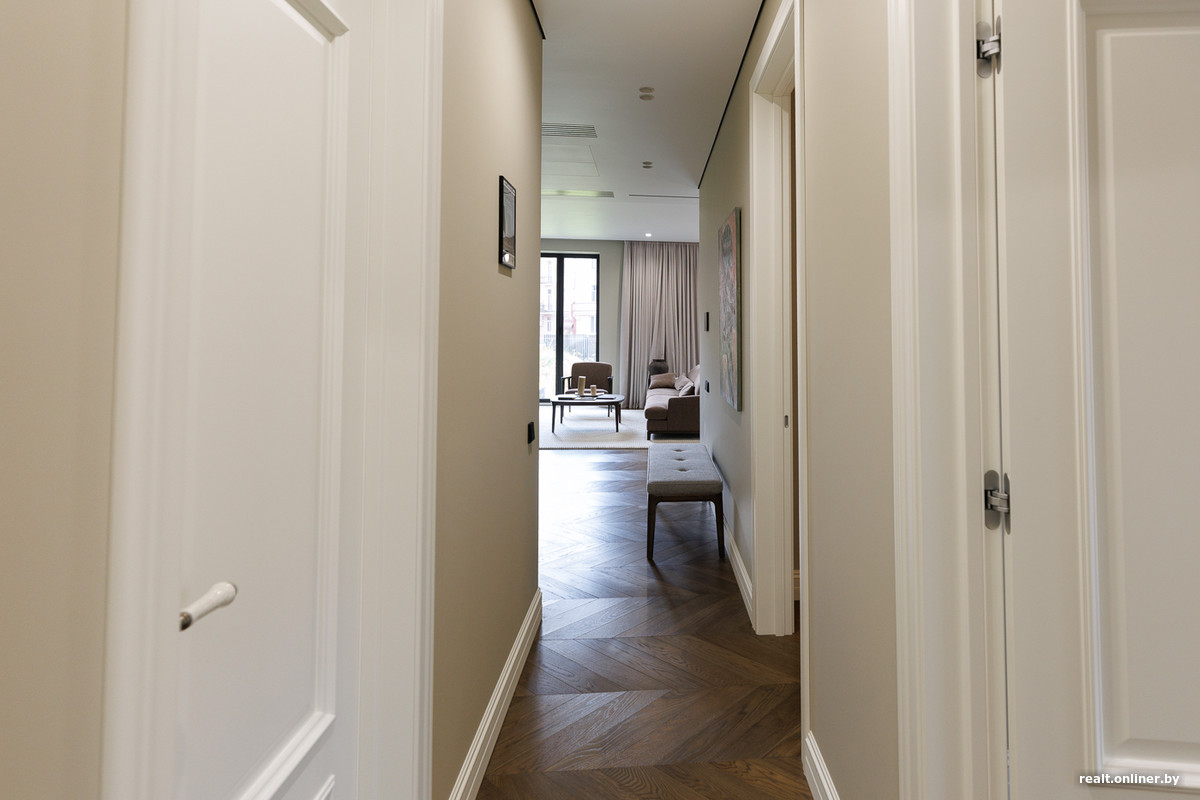 За соседней дверью (с умным замком, работающим в том числе по отпечатку пальца) скрывается любимая многими классика: «французская елка» на полу, филенчатые двери, «резные» плинтуса. Квартира проходит под грифом Dark, поэтому паркет более строгий, стены в комнатах уже не белые, а с оттенком, мебель тоже в темных тонах (практичные люди, выдыхайте).