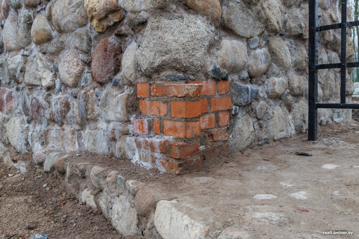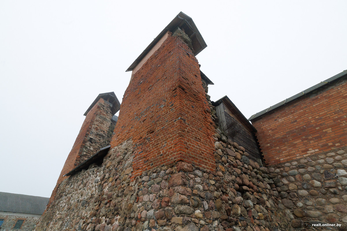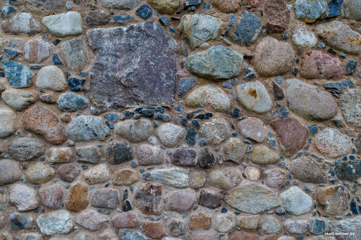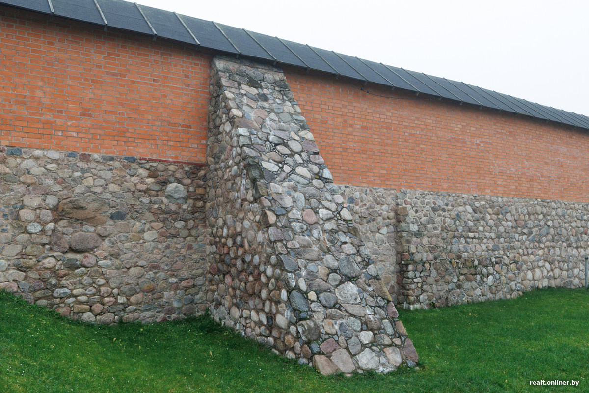 И все же аутентичная каменная кладка в замке местами сохранилась. Хотите найти ее — обращайте внимание на более темные участки. Узенькую средневековую «муровку» можно разглядеть, например, внизу восточной стены. В основном же от былых стен толщиной 2,5 метра осталась лишь забутовка — внутренняя прослойка, которой заполнялось пространство между внешней и внутренней каменными поверхностями ограждения замка. В дело шли и камни, и битый кирпич, которые заливались известковым раствором. И поверх этой забутовки строители уже наращивали каменную кладку.