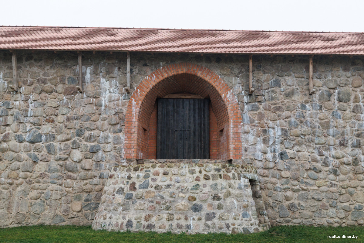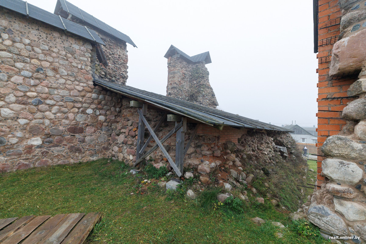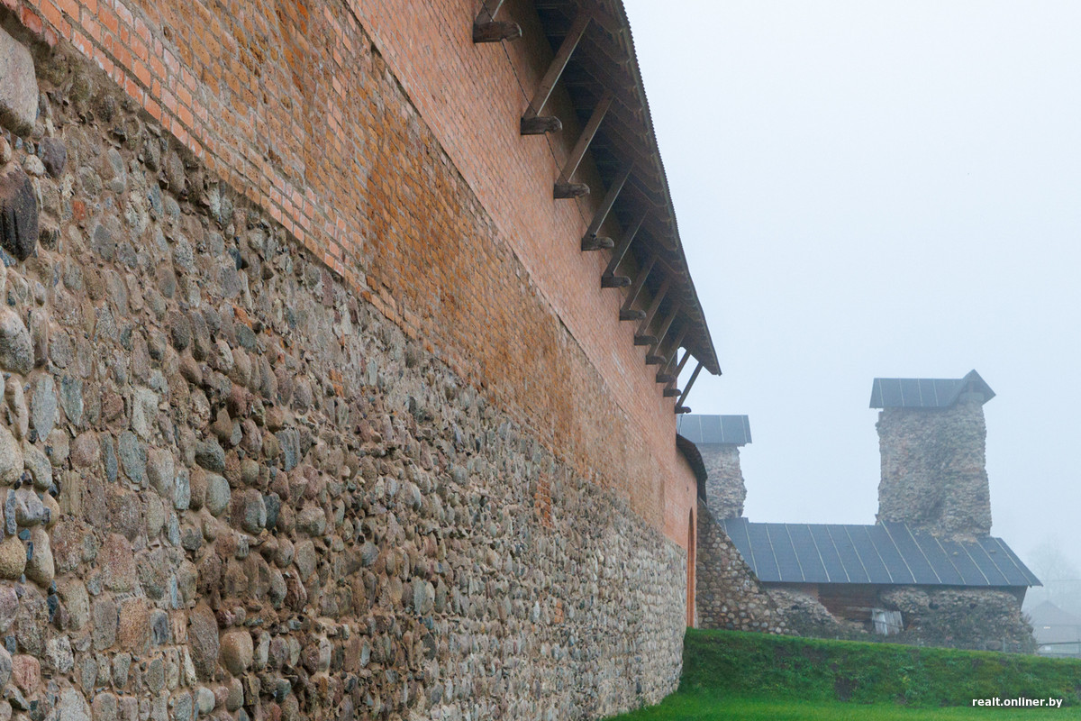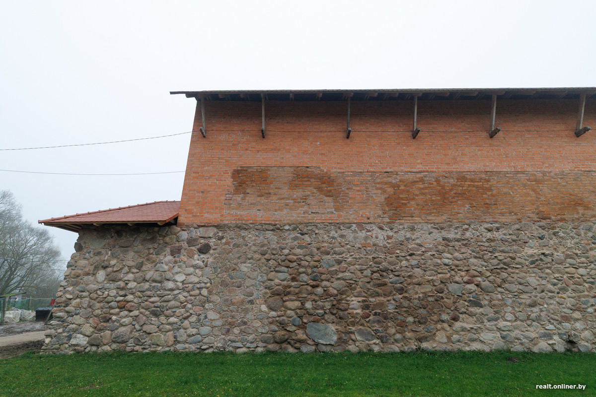 И все же аутентичная каменная кладка в замке местами сохранилась. Хотите найти ее — обращайте внимание на более темные участки. Узенькую средневековую «муровку» можно разглядеть, например, внизу восточной стены. В основном же от былых стен толщиной 2,5 метра осталась лишь забутовка — внутренняя прослойка, которой заполнялось пространство между внешней и внутренней каменными поверхностями ограждения замка. В дело шли и камни, и битый кирпич, которые заливались известковым раствором. И поверх этой забутовки строители уже наращивали каменную кладку.