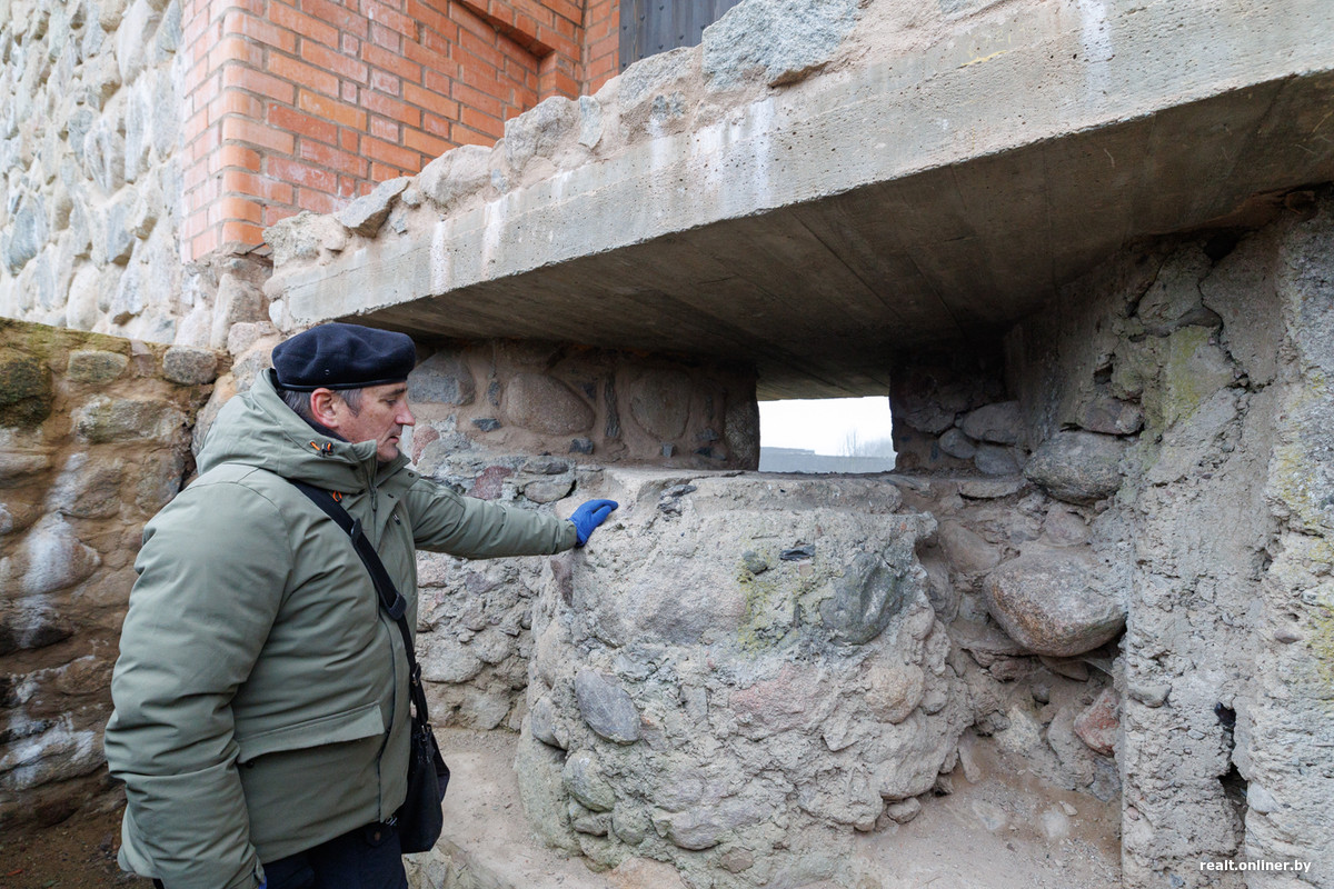 — Гэтая сцяна была завалена, і візуальна ў ёй выступала верхняя ніша, дзе ёсць след дрэва. Я меркаваў, што гэта была проста частка ўнутранай канструкцыі замка. Пры будаўніцтве мураваных замкаў звычайна выкарыстоўваецца драўляны каркас, каб вапнавая рошчына магла высахнуць. Былі таксама рыштаванні, адтуліны ад якіх пасля прыстасоўваліся пад бэлькі баявых галерэй. Але калі мы пачалі разбіраць завал, знайшлі ўнутры вежы прыступкі. Гэта значыць, тут была лесвіца і тунэль, па якім можна было перамяшчацца паміж ярусамі вежы. Я пасля гэтага не мог спаць, — признается историк.