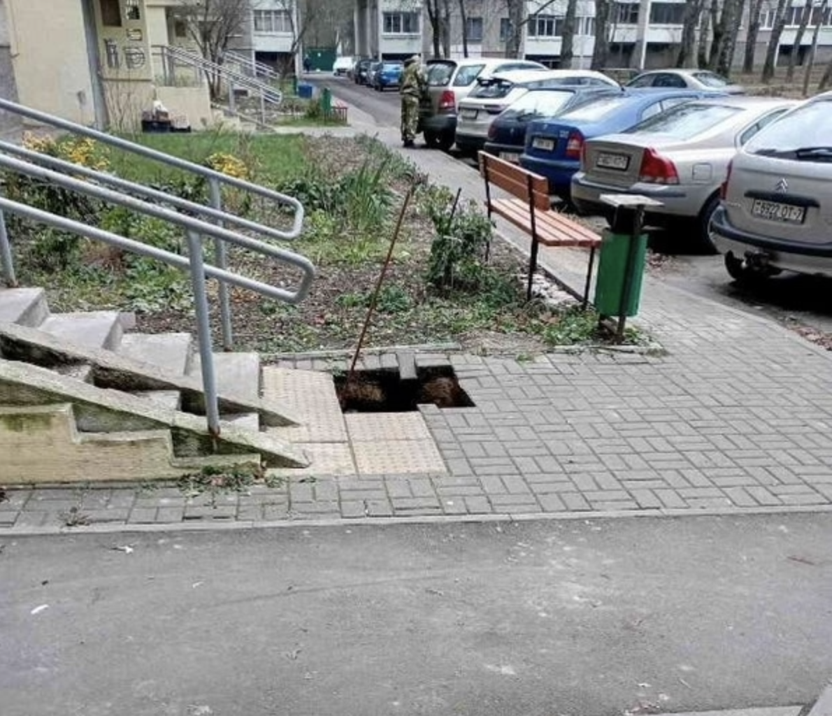 Чего точно не ожидаешь, выходя из подъезда, так это обвала земли под ногами. Однако именно такой странный случай произошел в минском дворе. Жительница дома на проспекте газеты Правда, 54 вышла из многоэтажки, спустилась по ступенькам и оказалась в довольно глубокой яме — под ее ногами обвалилась плитка. Что это было?