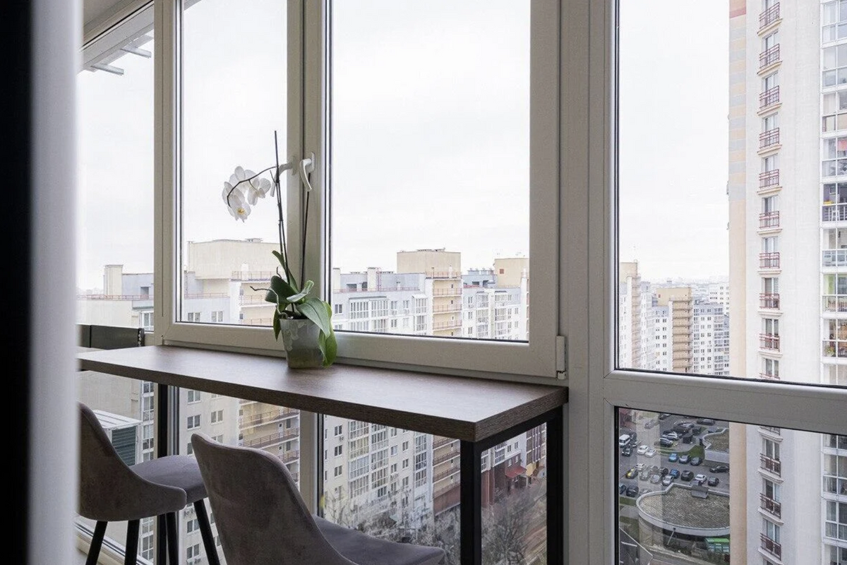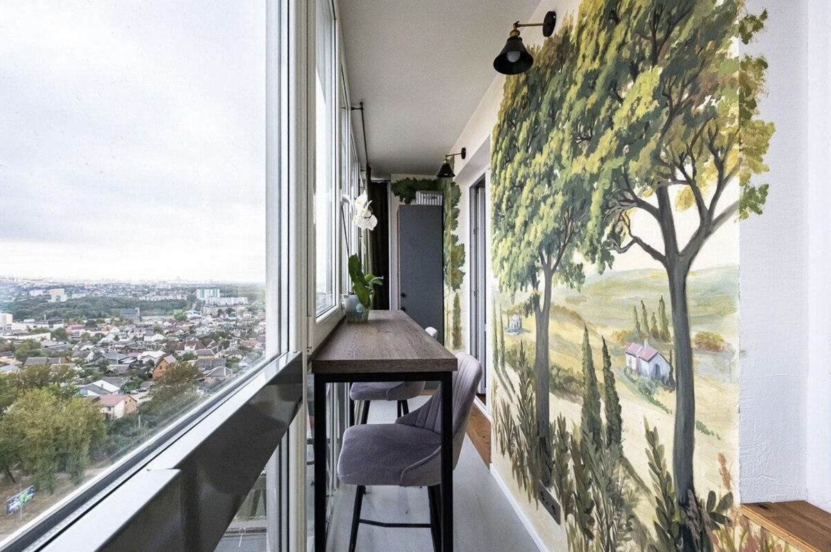 Лоджия в квартире на улице Богдановича имеет совсем скромные размеры — всего 4 метра. Однако у нее есть и преимущества: длинная форма и шикарный вид из окон. Владелец жилья решил использовать эти обстоятельства по полной.
