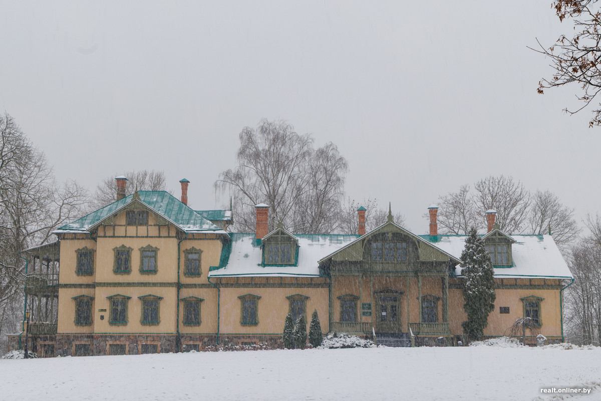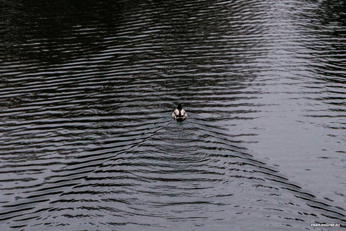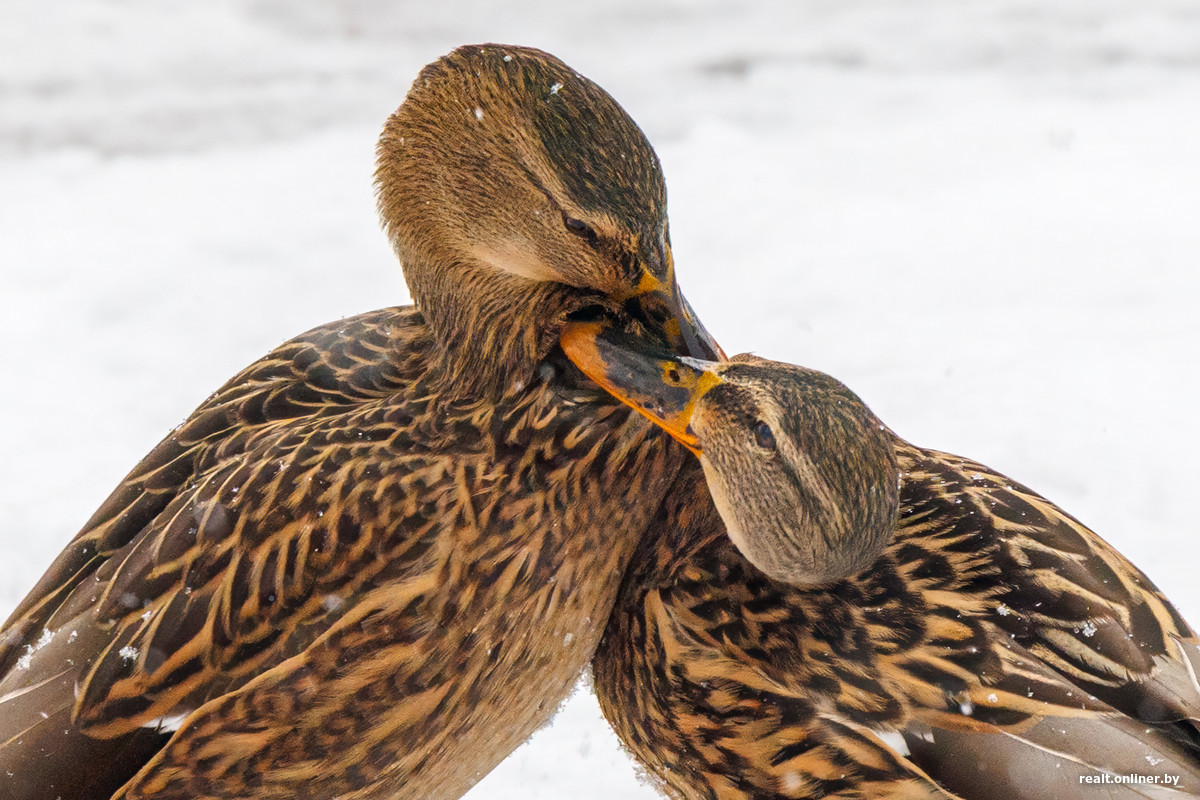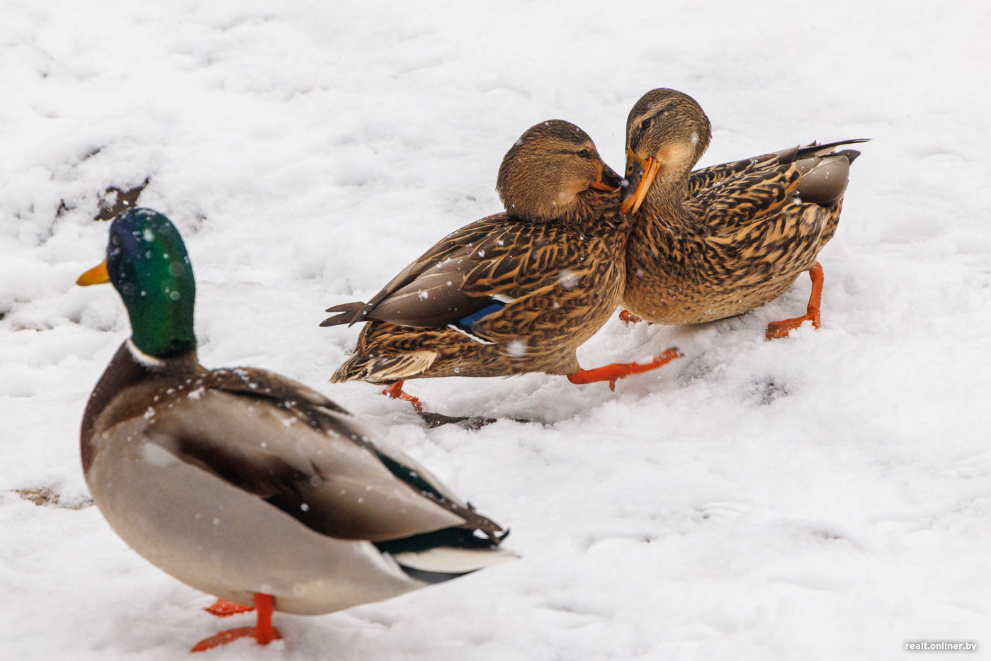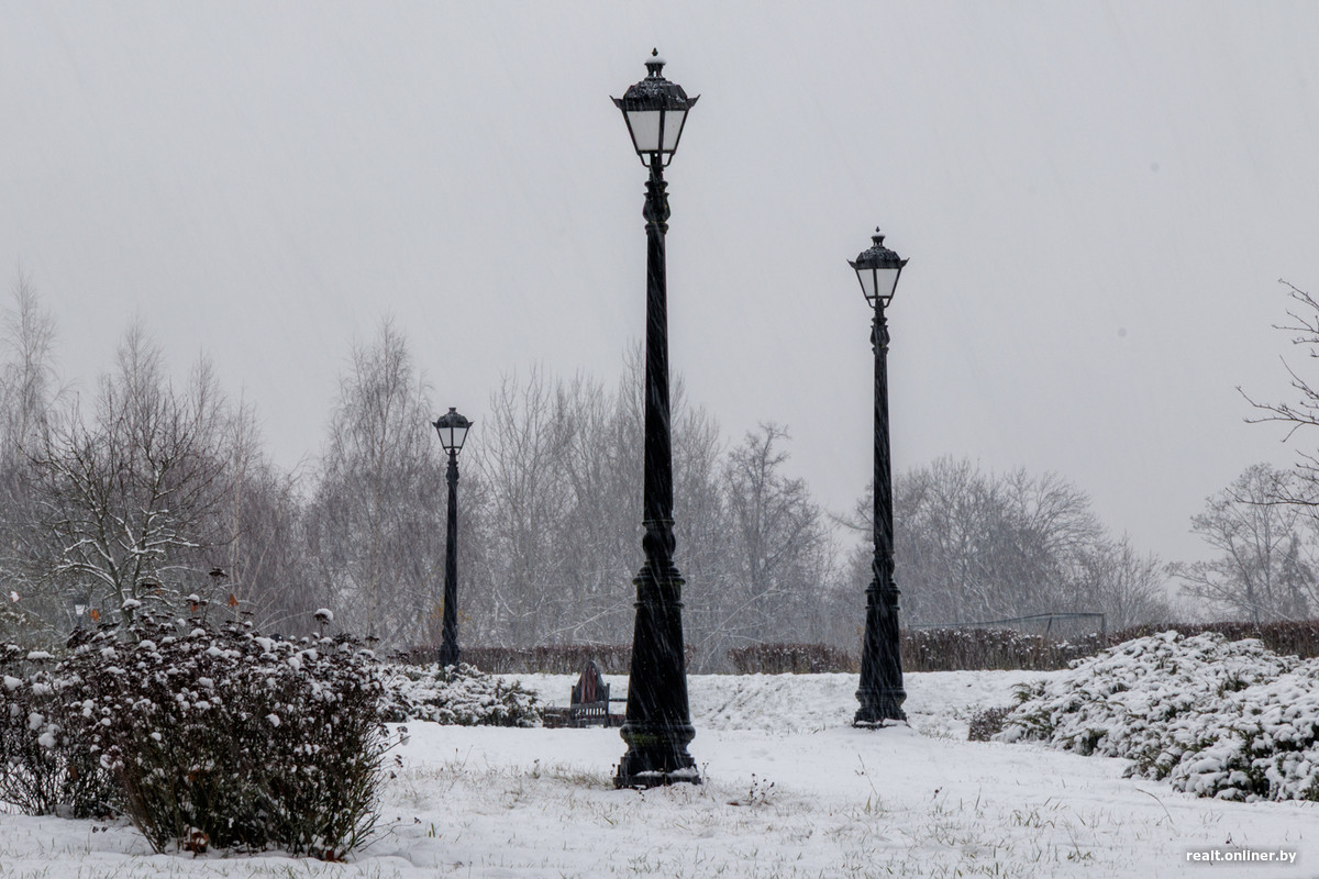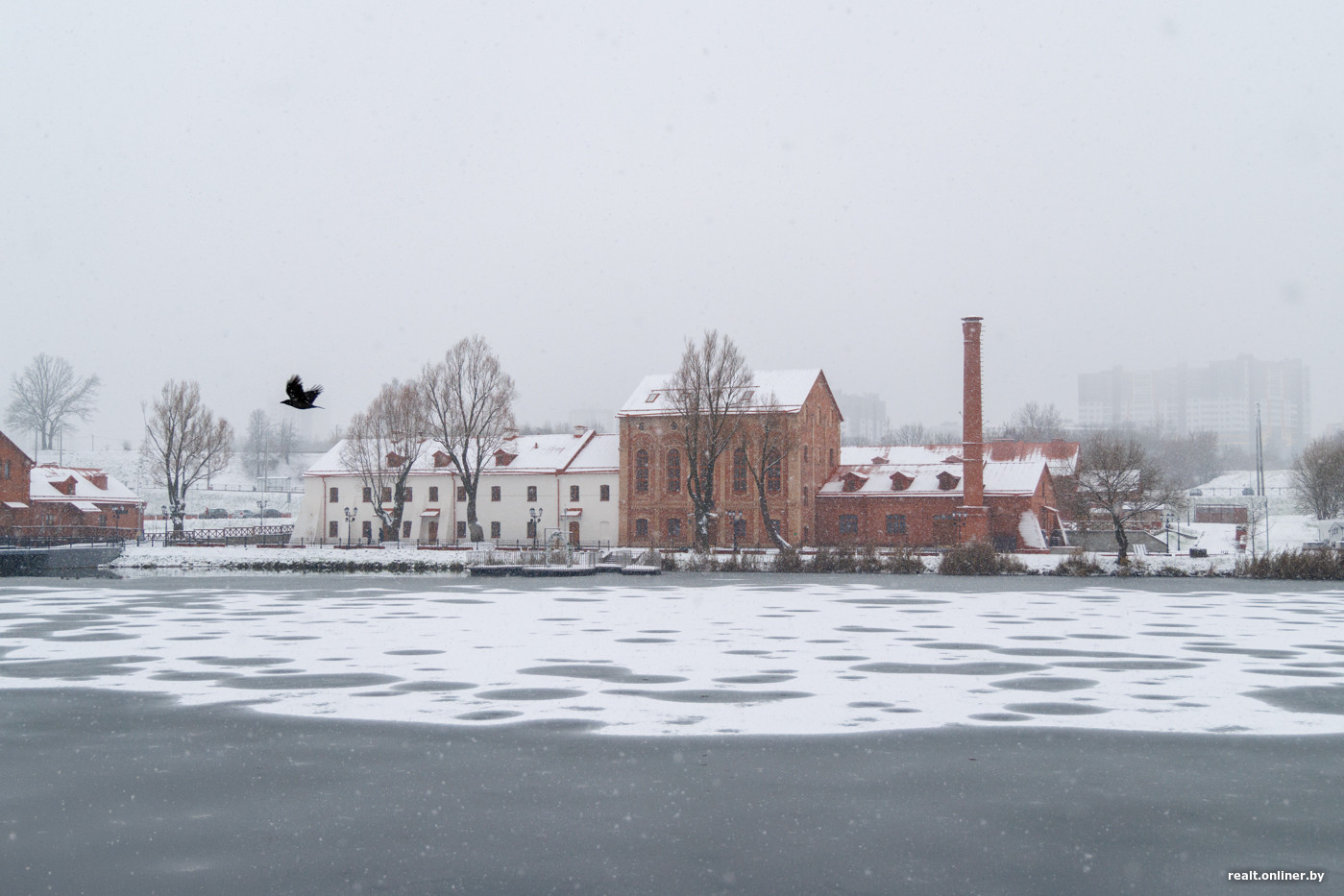 Лошицкий парк во время пика первого снегопада выглядел безлюдно — вероятно, люди не рискнули вот так сразу надеть шапки с варежками и побежать радоваться красоте. Изредка прогуливались мамы с колясками и спешащие куда-то горожане. Главными героями стали обнимающиеся утки — просто посмотрите, какая милота. Заснеженный комплекс зданий бывшей винокурни, который переделали в многофункциональный комплекс с загсом и рестораном, издалека выглядит очень аутентично.