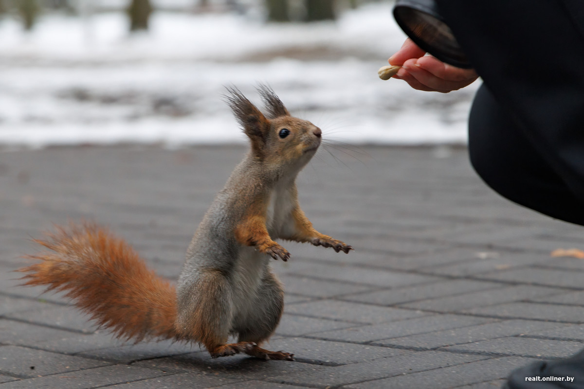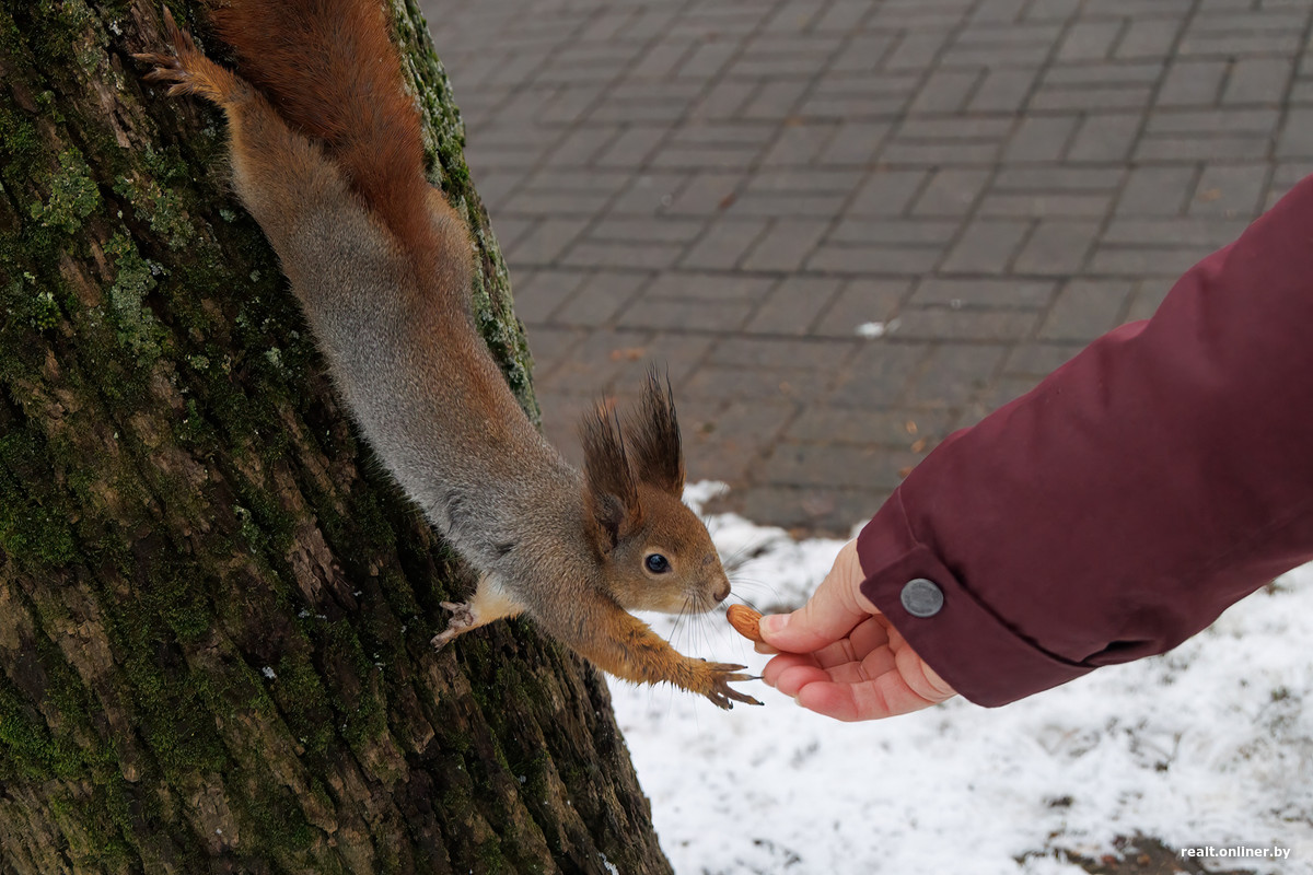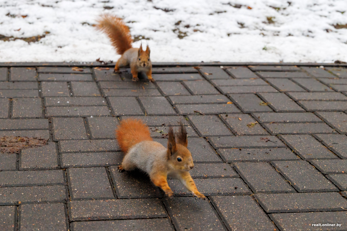 Известно, что в парке Горького много белок. Фотографу Onlíner удалось запечатлеть нескольких проворных хвостатых, которые наглым образом прибежали к людям поживиться чем-то вкусненьким. А вообще живности здесь много — сможете угадать виды попавших в кадр пернатых?