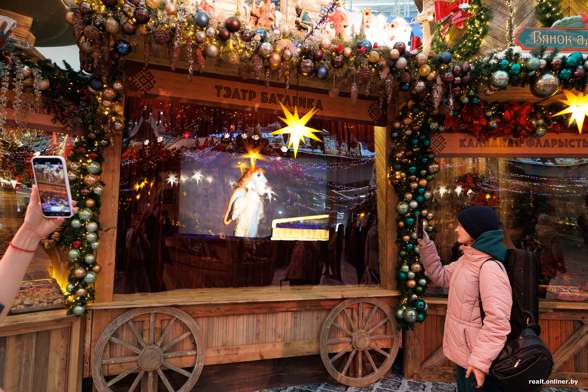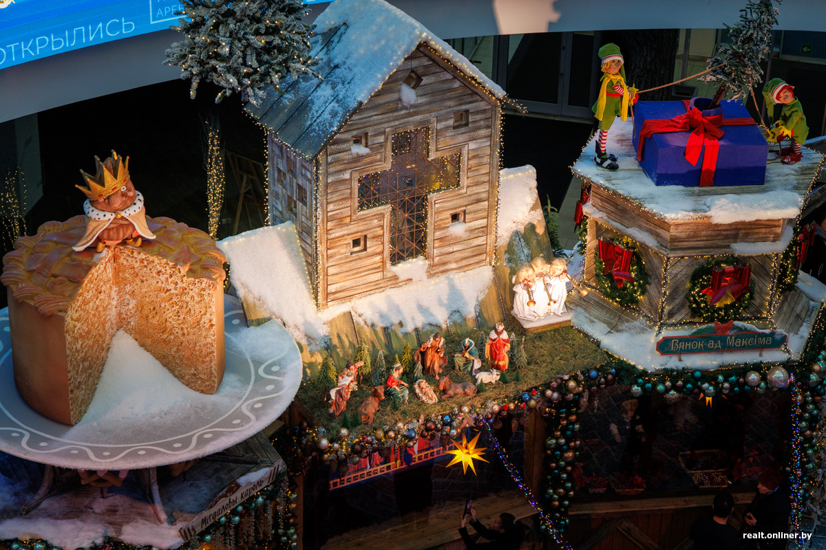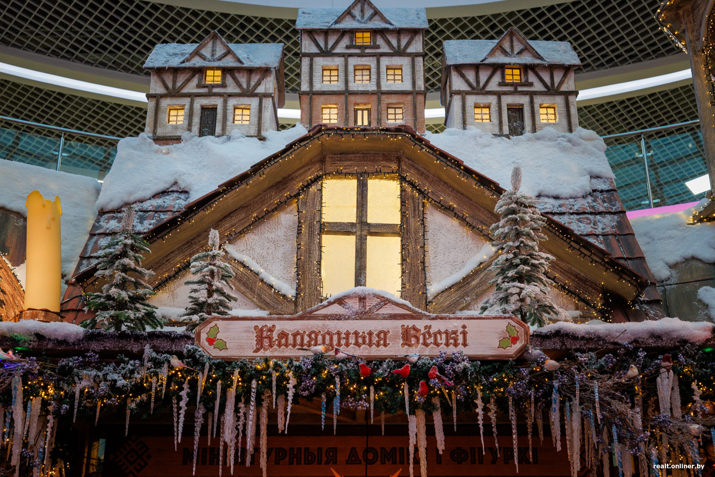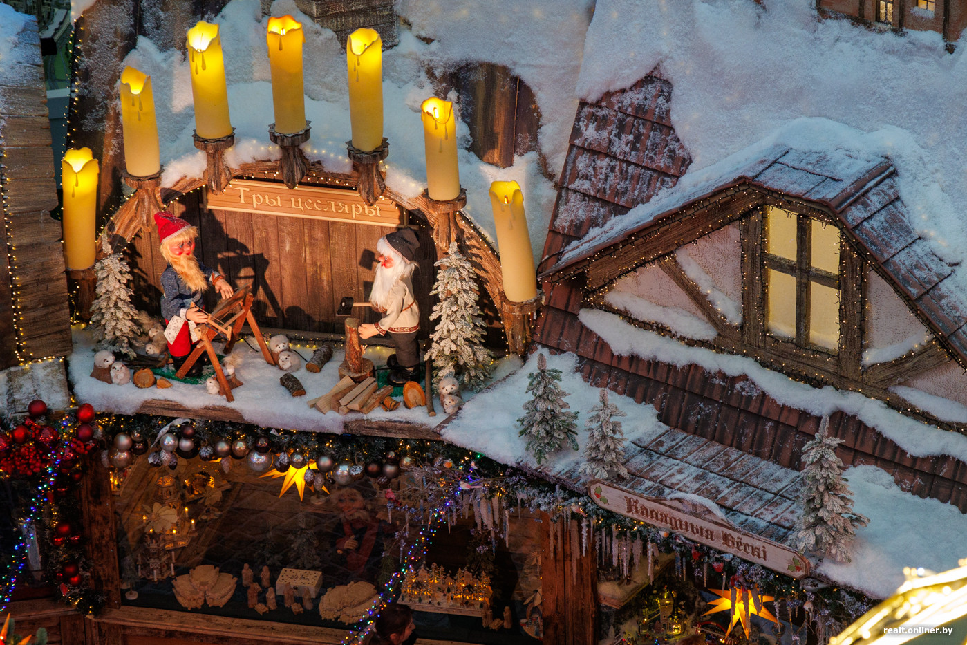 Инсталляция называется «Калядны кірмаш». Она засыпана искусственным снегом, а ее составляющие двигаются и издают звуки. Конечно же, все представленное в деревянных домиках — это украшения, муляж, купить это нельзя. Зато можно изучать, фоткаться, прогуливаться вдоль торговых павильонов и ловить новогоднее настроение. Что и будут делать минчане в ближайшее время.