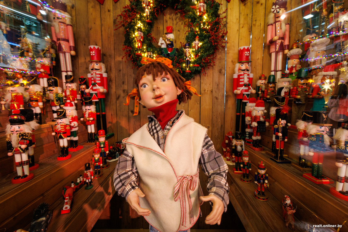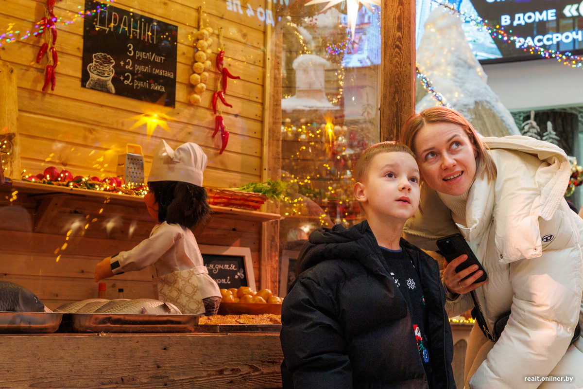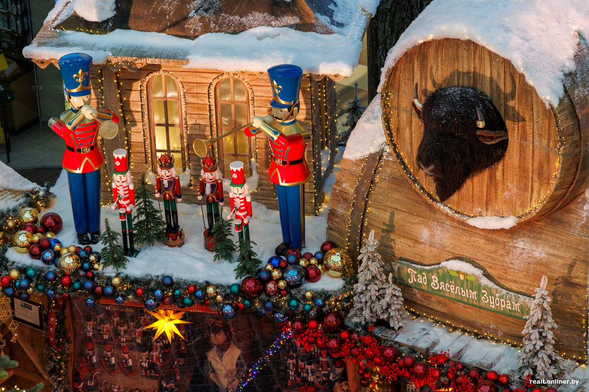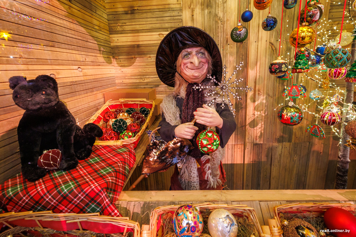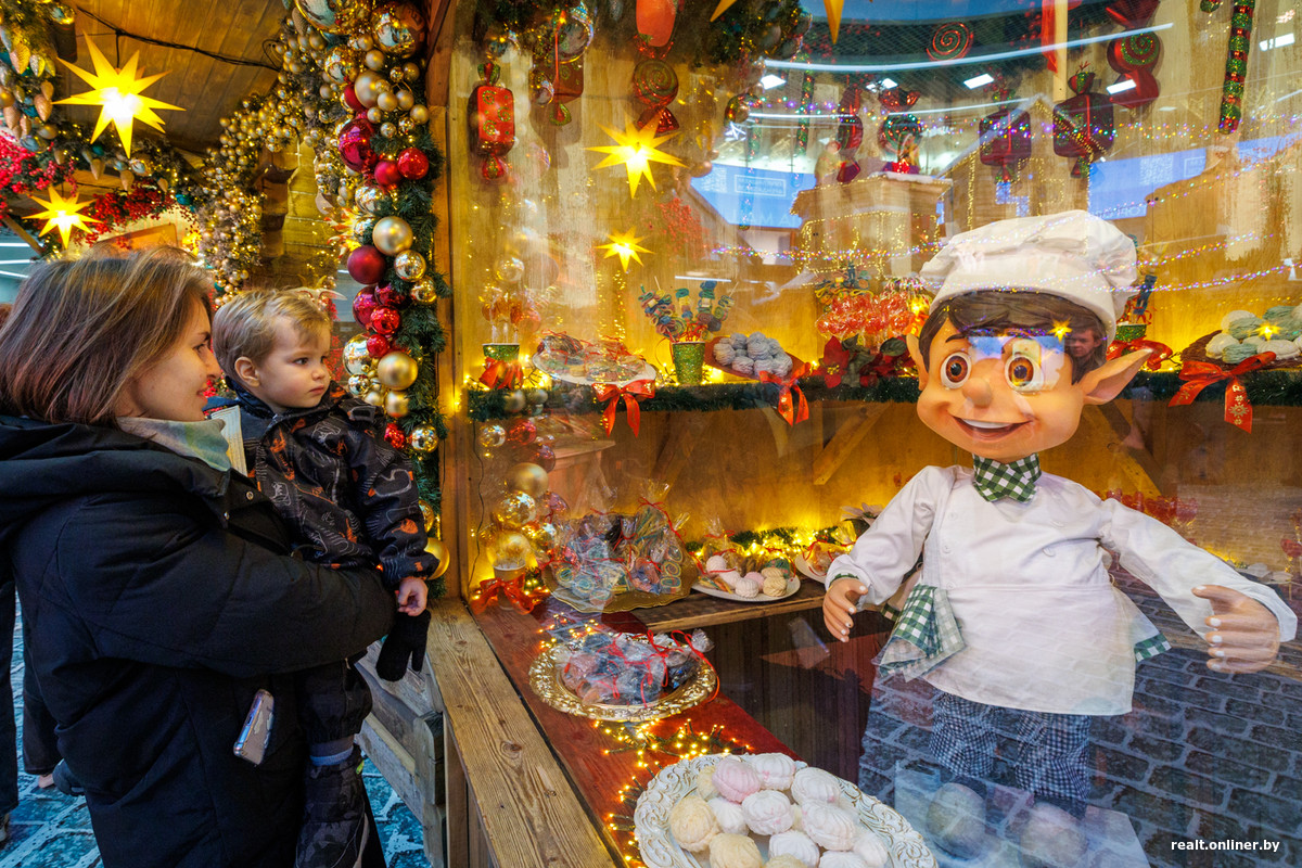 Инсталляция называется «Калядны кірмаш». Она засыпана искусственным снегом, а ее составляющие двигаются и издают звуки. Конечно же, все представленное в деревянных домиках — это украшения, муляж, купить это нельзя. Зато можно изучать, фоткаться, прогуливаться вдоль торговых павильонов и ловить новогоднее настроение. Что и будут делать минчане в ближайшее время.