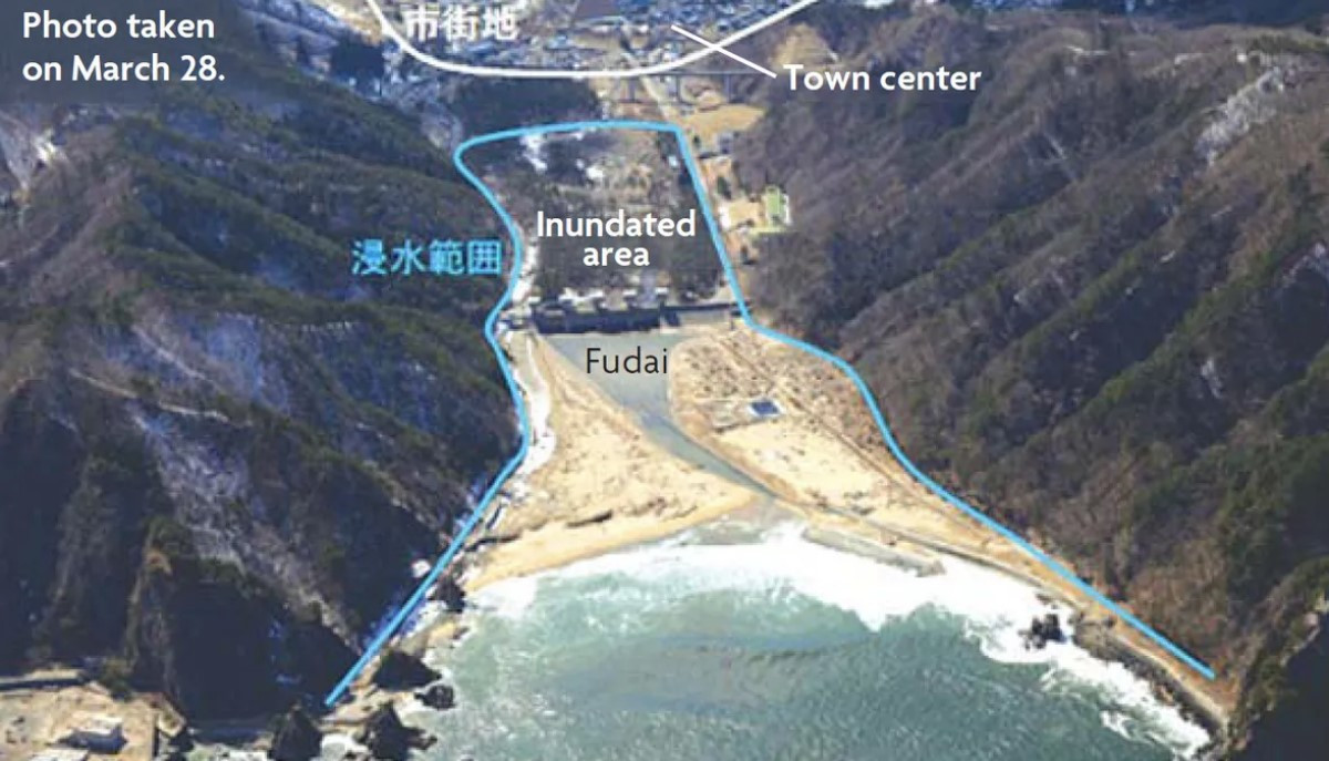Спустя 10-30 минут на северо-восточное побережье острова Хонсю обрушилась волна, высота которой достигала 40 метров. Именно цунами сносило дома, затопило аэропорт Сендая, бесследно смыло поезд, следовавший из Сендая в Исиномаки, привело к серьезной радиационной аварии на АЭС «Фукусима-1». В значительном числе случаев сооружения, построенные заранее и призванные защитить населенные пункты от катастрофического воздействия цунами, не помогли. Землетрясение оказалось слишком мощным, а цунами высоким. Но деревня Фудаи не просто выжила, а в отличие от многих своих соседей, практически не пострадала.