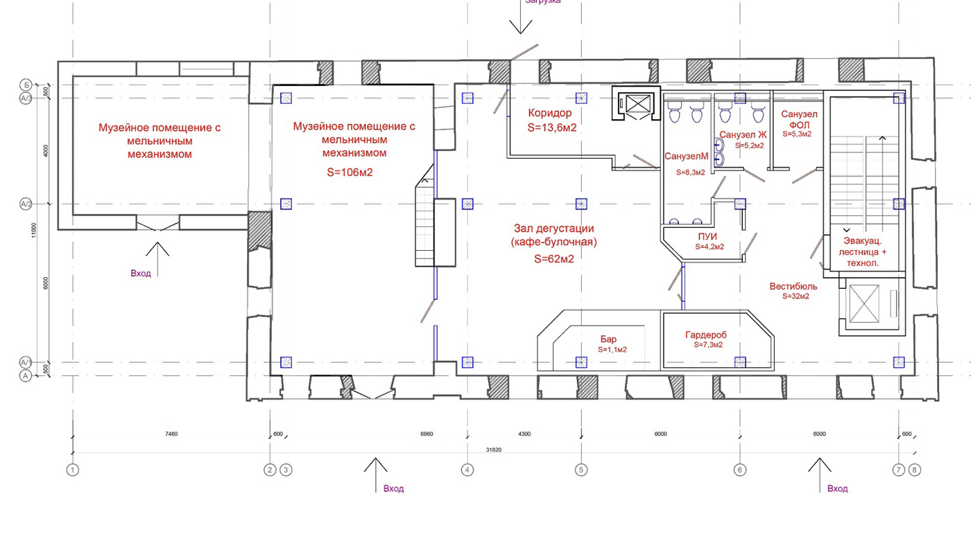 По планировке видно, что в бывшей мельнице откроют музей, кафе, пекарню, бар.