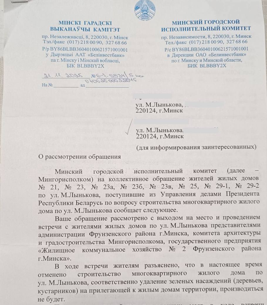И вот на днях обеспокоенные местные жители получили официальный ответ из Мингорисполкома. На место выезжала целая комиссия, в итоге было объявлено, что «в настоящее время строительство многоквартирного дома по ул. М. Лынькова отменено, соответственно, удаление зеленых насаждений (деревьев, кустарников) на прилегающей к жилым домам территории производиться не будет».