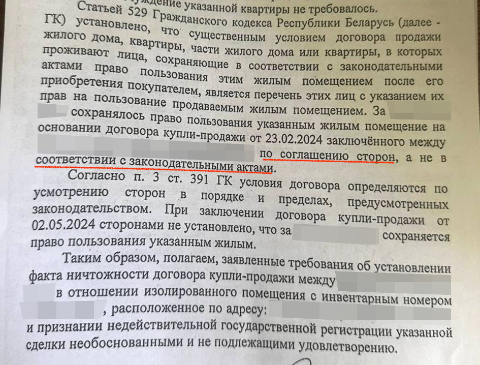 Спустя некоторое время с Ларисой связалась знакомая Павла — Ольга, которая предложила встретиться и поговорить. При встрече Ольга предупредила, что собирается приобрести спорную квартиру. В апреле 2024 года девушка сообщила Ларисе, что сделка состоялась. После этого Ольга направила в адрес бывшей хозяйки претензию с требованием выселиться из жилья. Новая собственница ссылалась на п. 2 ст. 89 Жилищного кодекса. Однако оснований для выселения по данной статье не имелось, поскольку за женщиной (в силу п. 3 договора купли-продажи квартиры от 23.02.2024 и заключенного ранее с Павлом договора) сохранялось право владения и пользования жилым помещением.