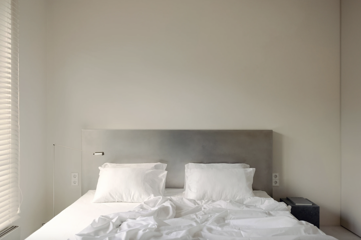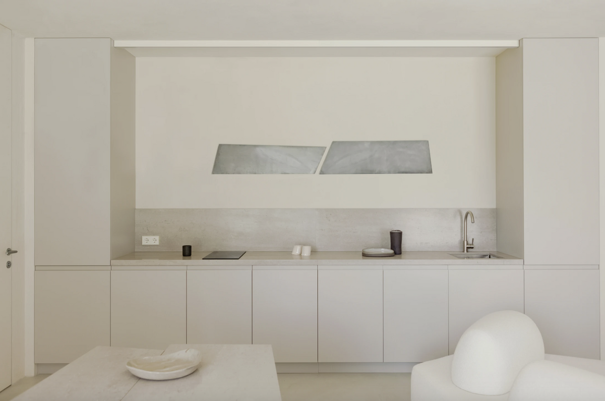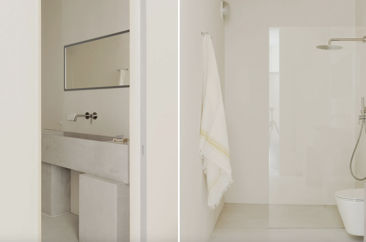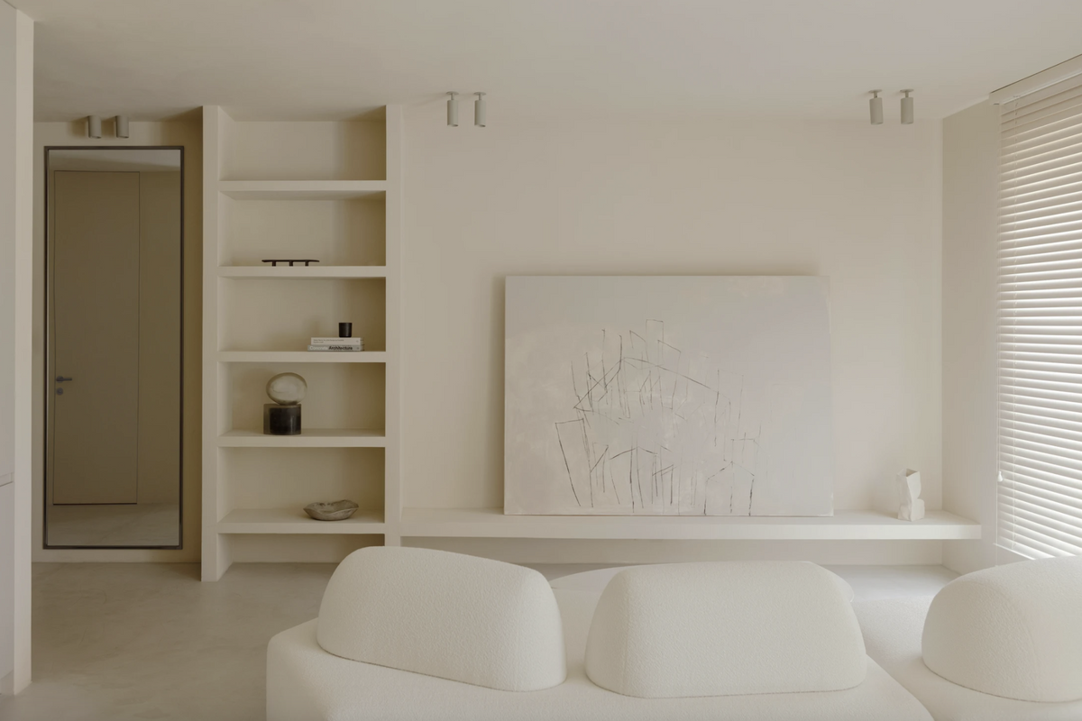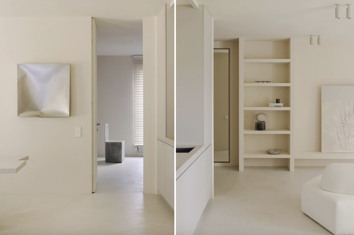 — Мы повсеместно использовали матовые штукатурки теплых белых тонов и светло-серый микроцемент на полу, чтобы создать мягкий цельный фон. Точечно был применен натуральный травертин: на столешнице кухни, обеденном столе и в умывальнике. Ниши в санузле имеют фасады, отделанные точно такой же штукатуркой, как и стены. Это создает иллюзию бесшовности и максимально сохраняет чистоту линий.