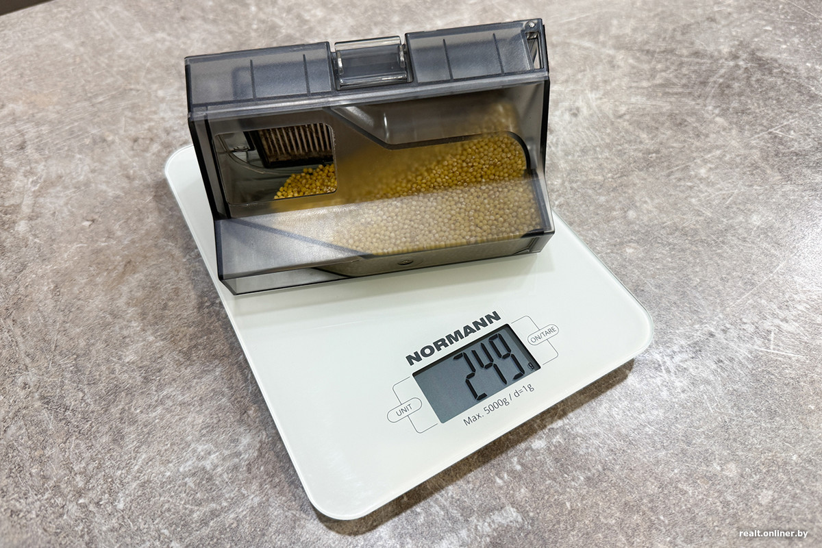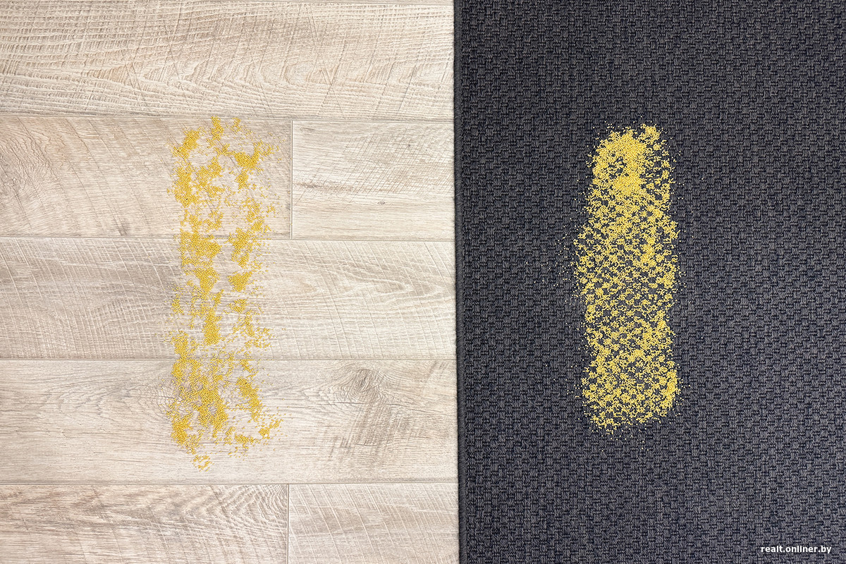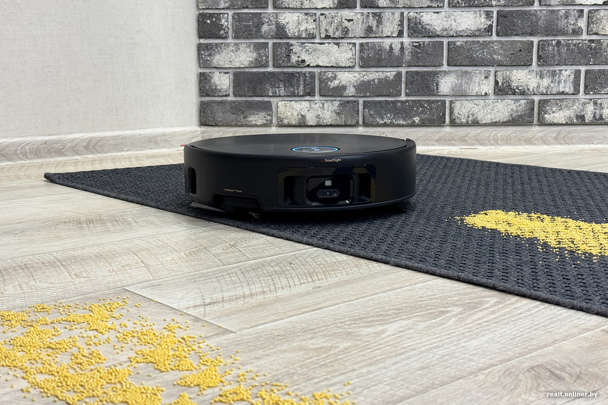 Рекордные 28 кПа, по нашим ожиданиям, просто обязаны были проявить себя в тестировании сухой уборки. Проверку проводили стандартно: 100 грамм крупы на ламинате и безворсовом ковре. Чтобы избежать ложных обходов, мы отключили интеллектуальный объезд препятствий и режим защиты от столкновений. Боковую щетку на коврах отключать не стали — и не прогадали.