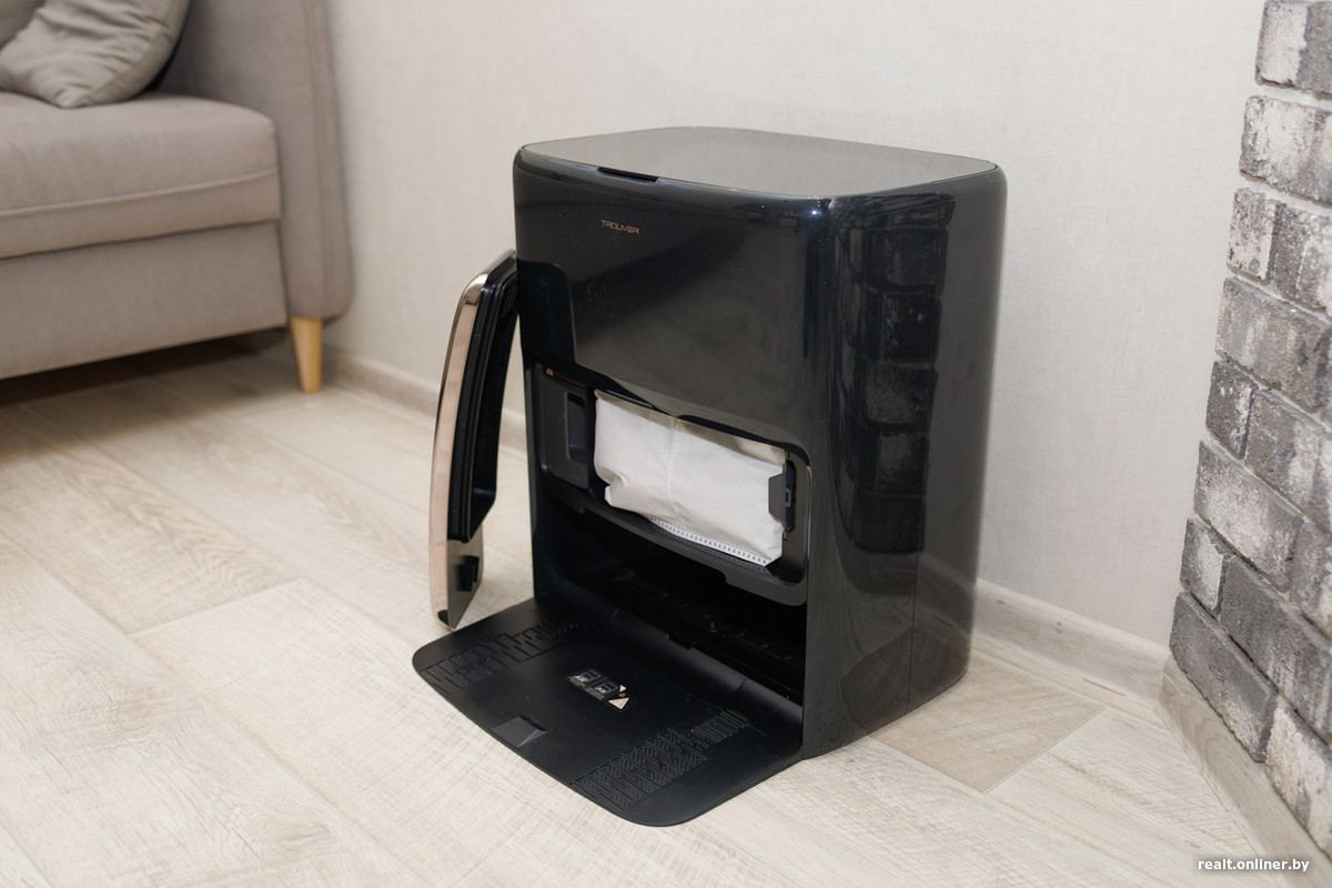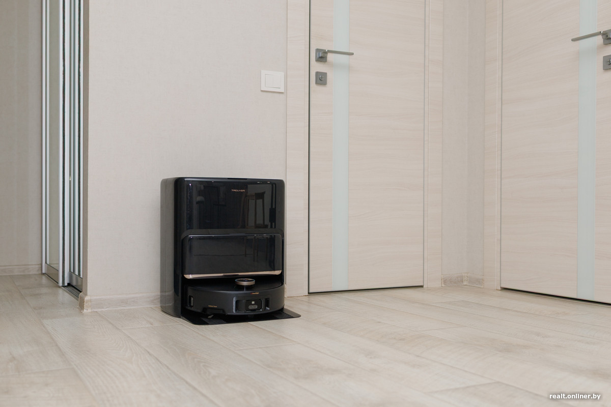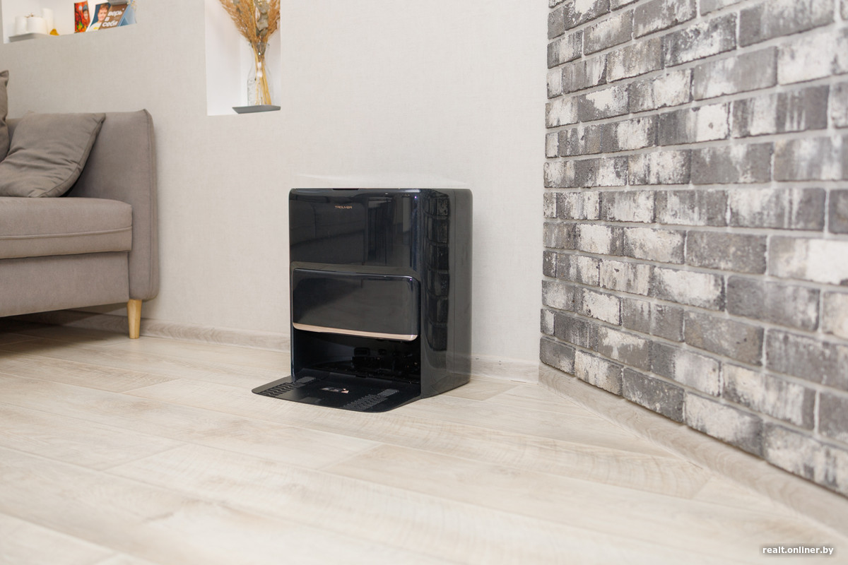 База многофункциональная, что уже привычно для флагманских моделей: она опустошает контейнер, моет валик горячей водой, сушит его теплым воздухом, самостоятельно промывает поддон и дозаправляет робота водой и моющим средством. Новшество — система DuoSolution с двумя контейнерами для моющего:
