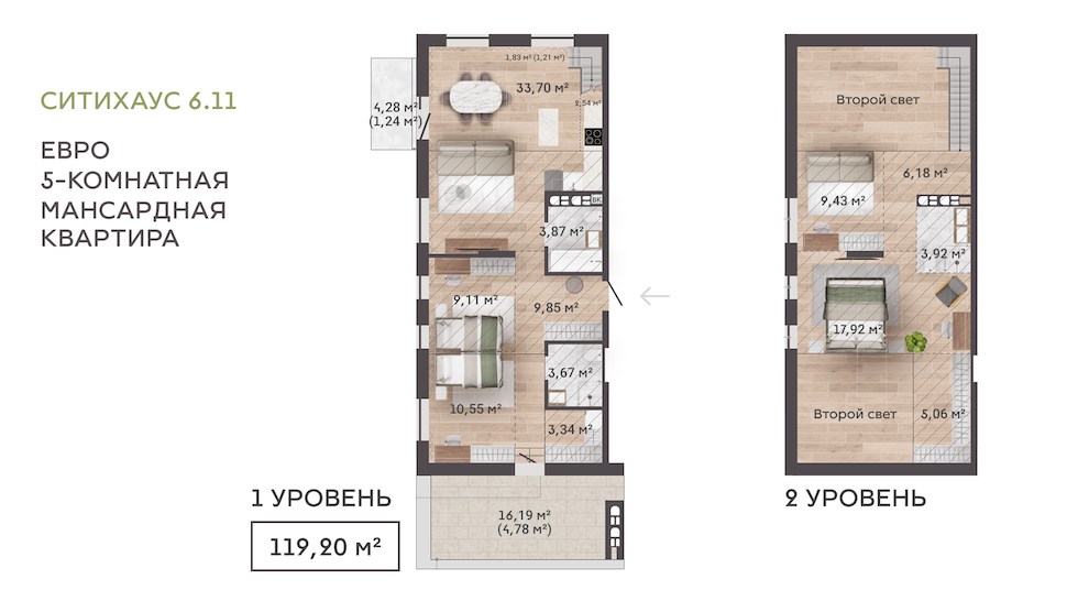 На последнем этаже запроектированы двухуровневые мансардные квартиры с потолками до 6,16 метра и окнами в крыше.