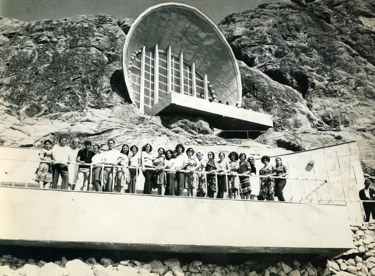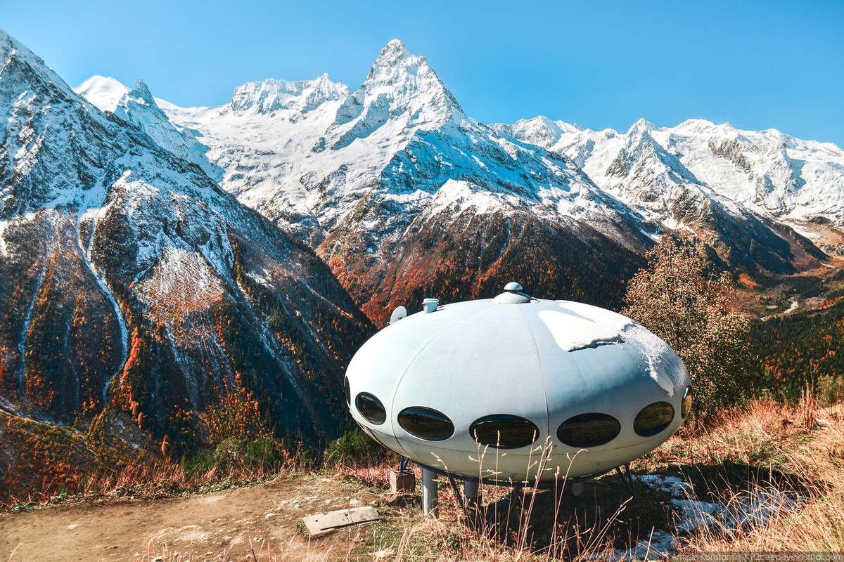 В 1969 году на склоне горы Мусса-Ачитара, на высоте 2250 метров над уровнем моря, приземлилась «летающая тарелка». Именно такую футуристическую форму выбрали архитекторы для небольшой гостиницы рядом с горнолыжным курортом Домбай.