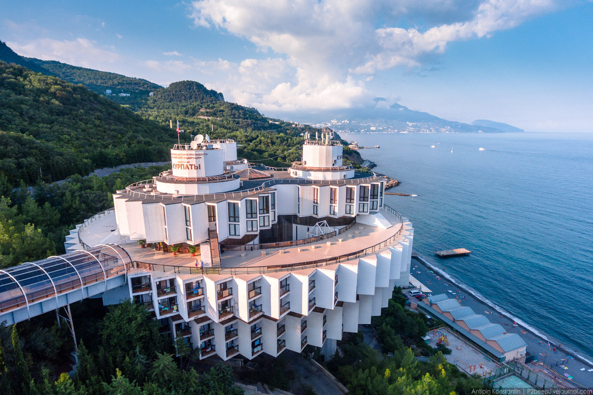 Пансионат в форме нескольких зубчатых дисков, установленных на трех опорах, возвели совместно советские и чехословацкие специалисты. Здание было предназначено для одновременного отдыха на южном берегу Крыма 400 граждан СССР и ЧССР.