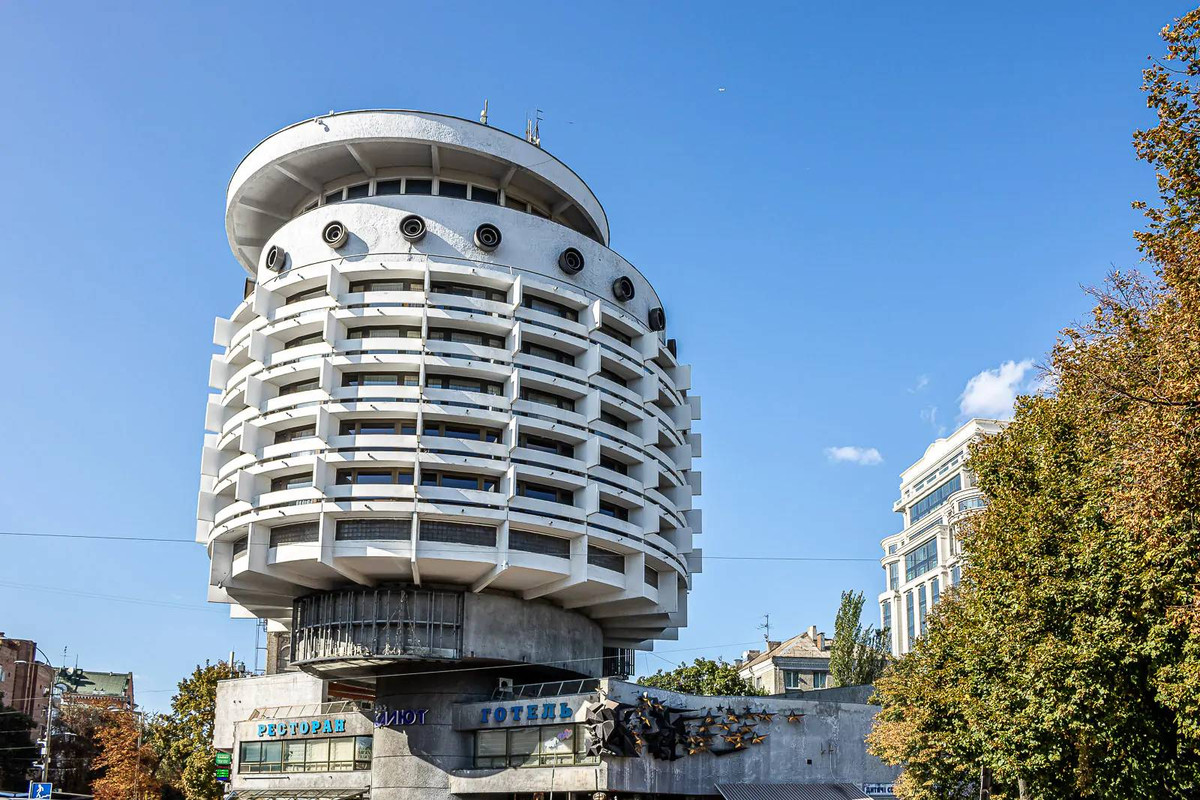 Здание, построенное в 1984 году (арх. А. Милецкий), представляет собой несущую бетонную трубу, на которую консольно навешены шесть жилых этажей, имеющих в плане форму эллипса. Внутри трубы находятся лифты, коммуникации и спиральный пандус, по которому можно спуститься с этажей гостиницы. На втором этаже стилобатной части здания расположен ресторан. Сверху, под крышей, предполагался второй — летний ресторан. В подвальной части находится паркинг для автомашин.