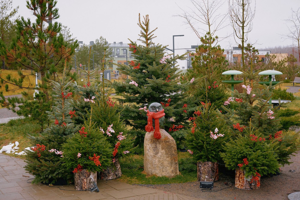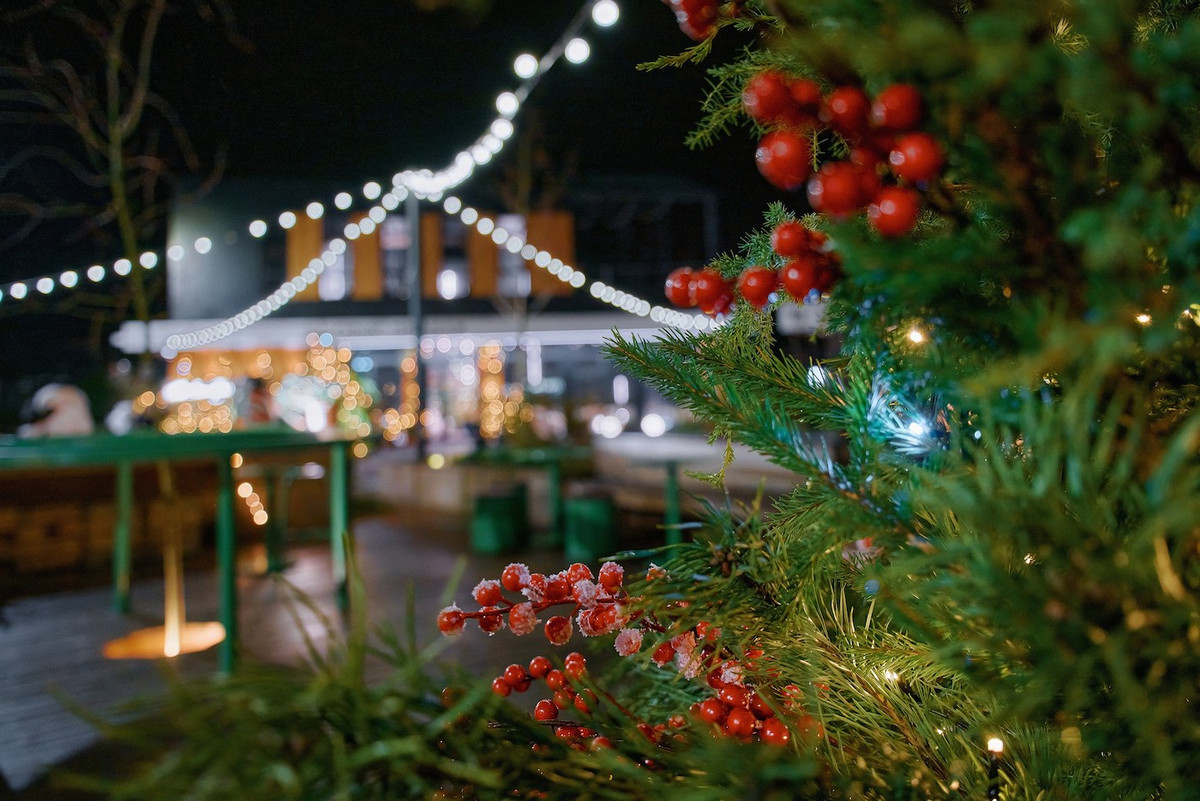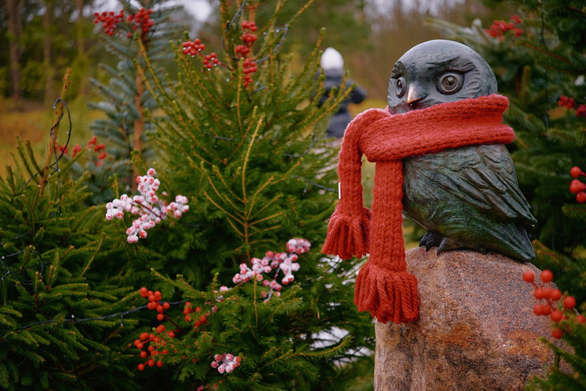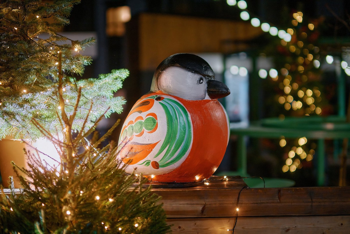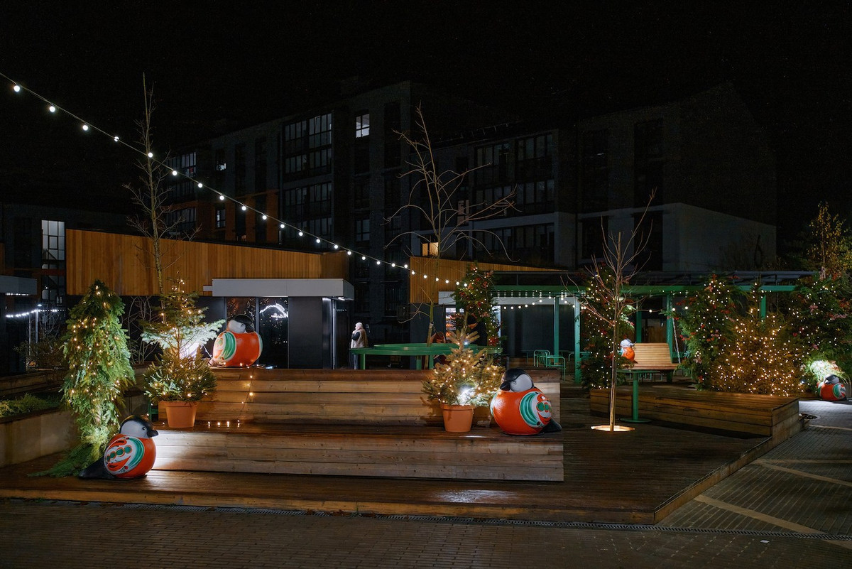 Скандинавскую идею сочетать простоту и натуральные материалы реализовали в кадках с елями, украшенными красными ягодными гроздьями и гирляндами. Импровизированный бор заселили расписанные в красно-зеленых тонах снегири и световые фигуры лесных жителей, а старожил «Зеленой гавани» — бронзовый сыч — уже получил в подарок вязаный красный шарф. Новогодние декорации по традиции установил застройщик «А-100 Девелопмент».