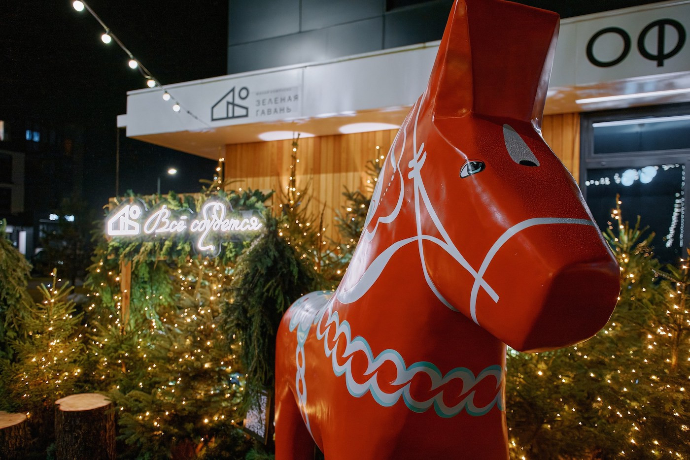 Главным объектом новогоднего арт-декора стала лошадка Dala, что, впрочем, неудивительно в канун наступающего года лошади. Маленькие деревянные фигурки этой лошадки считаются одним из главных праздничных символов Швеции. В белорусском исполнении Далу сделали большой красной лошадью и «запрягли» в белую сбрую.