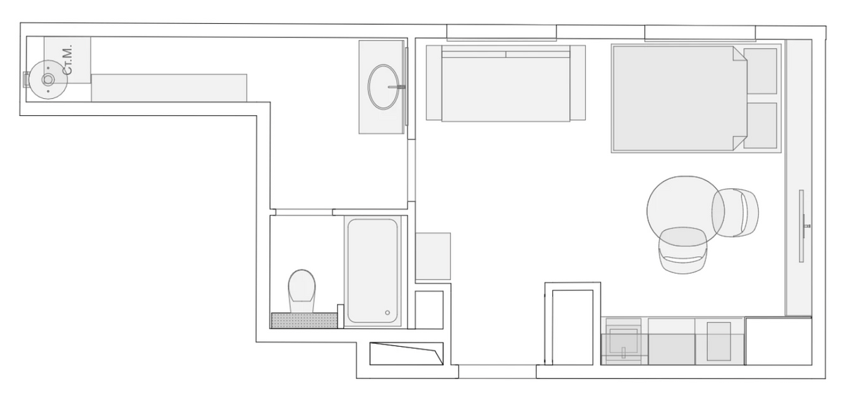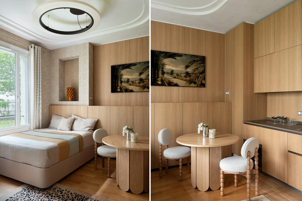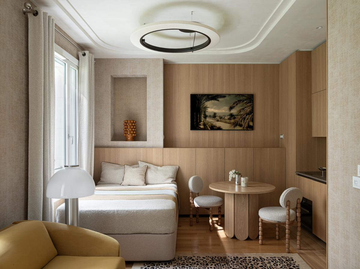 Пример такой нетипичной маленькой квартиры приводит портал interior.by. Отмечается, что жилье для студентки Сорбонны обустраивала дизайнер Екатерина Володина. Запрос был такой: на 29 метрах разместить все необходимое для комфортной жизни молодой девушки — от посудомоечной машины и духовки до дивана для гостей.