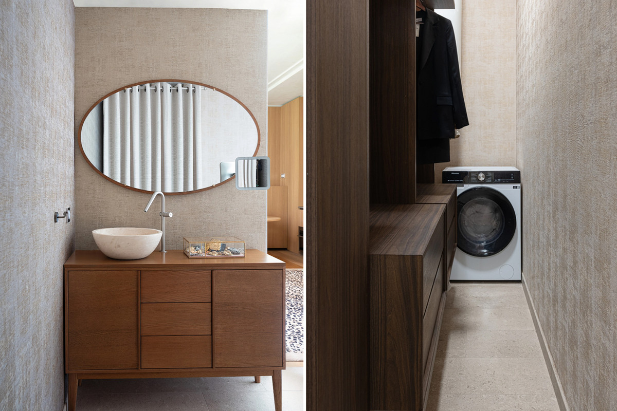Гардероб заказчицы вместе со стиральной машиной спрятали в узкой технической комнате за плотной шторой.