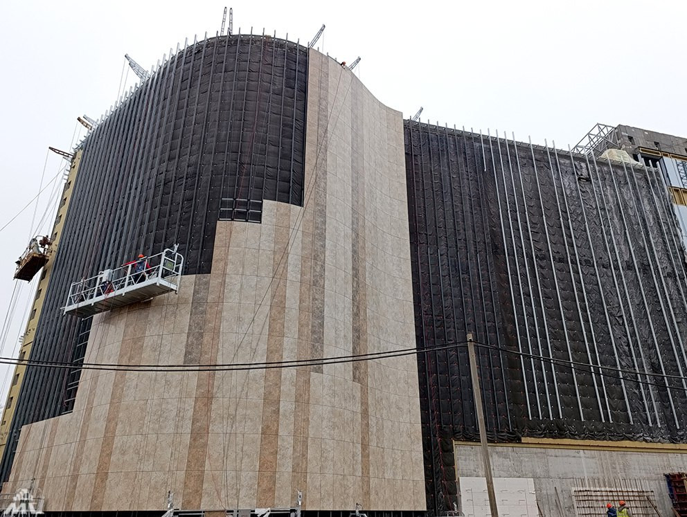 Осуществляются и фасадные работы. На 50% выполнено утепление здания, его облицовывают керамогранитом и монтируют витражи.