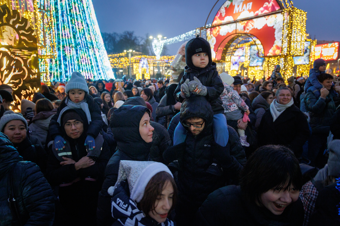 В этом году елку оформили в классической новогодней гамме: белые, синие и золотистые шары, гирлянды и звезда на макушке. Высота осталась привычной — около 30 метров.