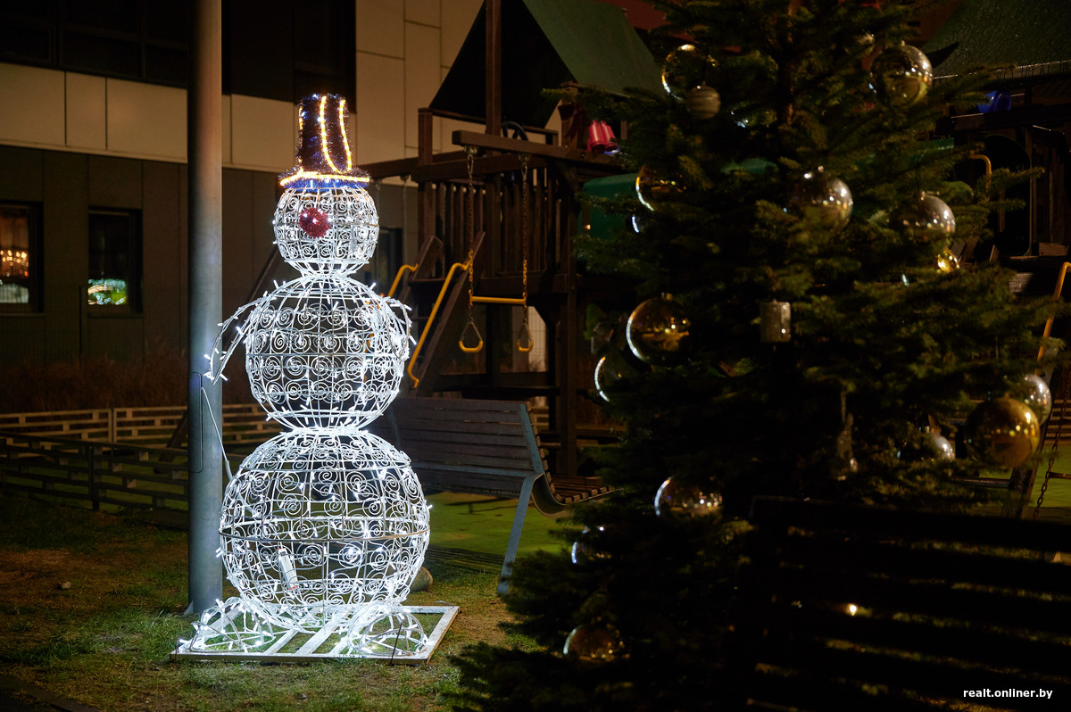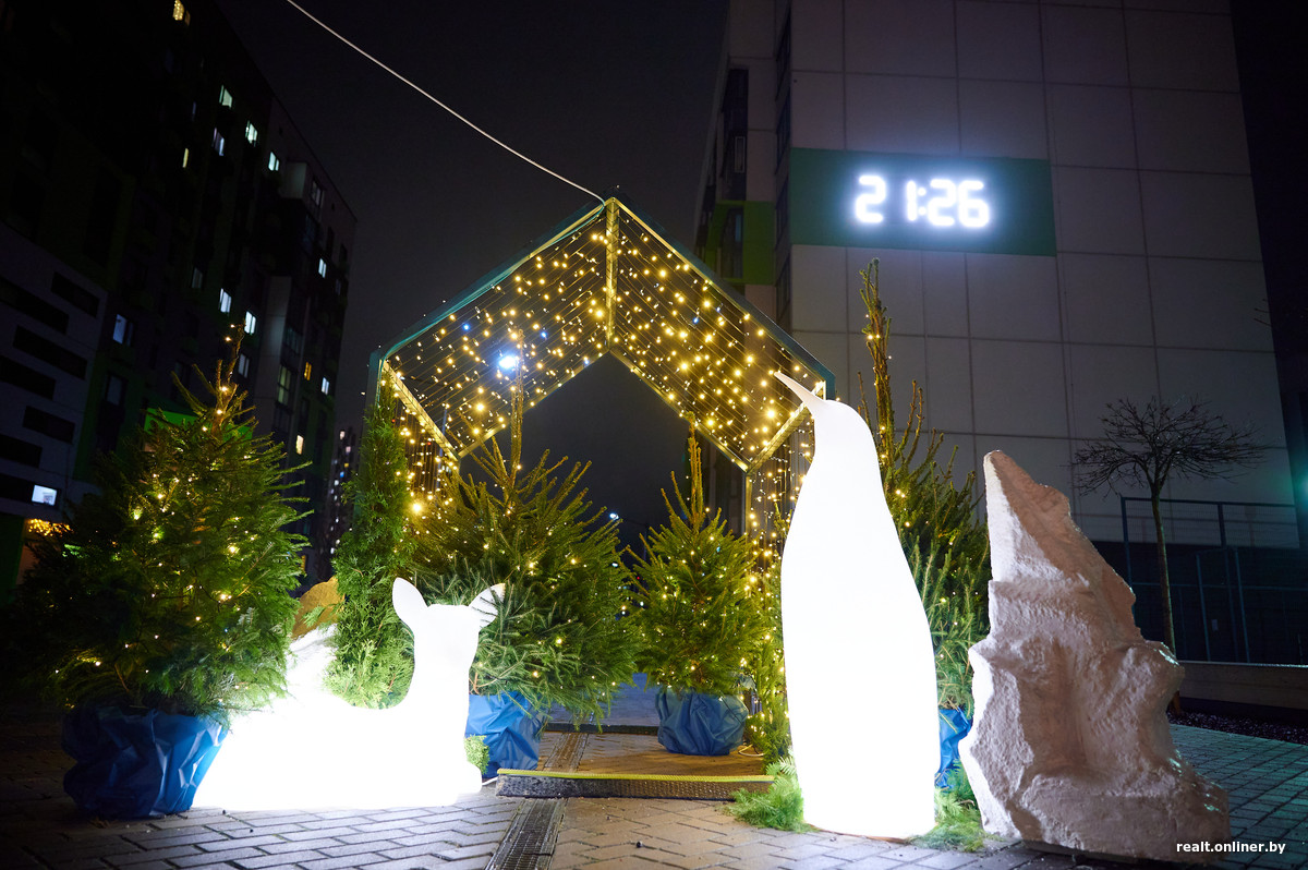 Праздничное настроение также создают беседки с наряженными елками и светящимися фигурками зверей – пингвина и оленя. Немного дальше можно приметить лося и снеговика. Мысли о Новом годе навевают и живые деревья с игрушками и гирляндами. Ими украшена почти вся «Новая Боровая».