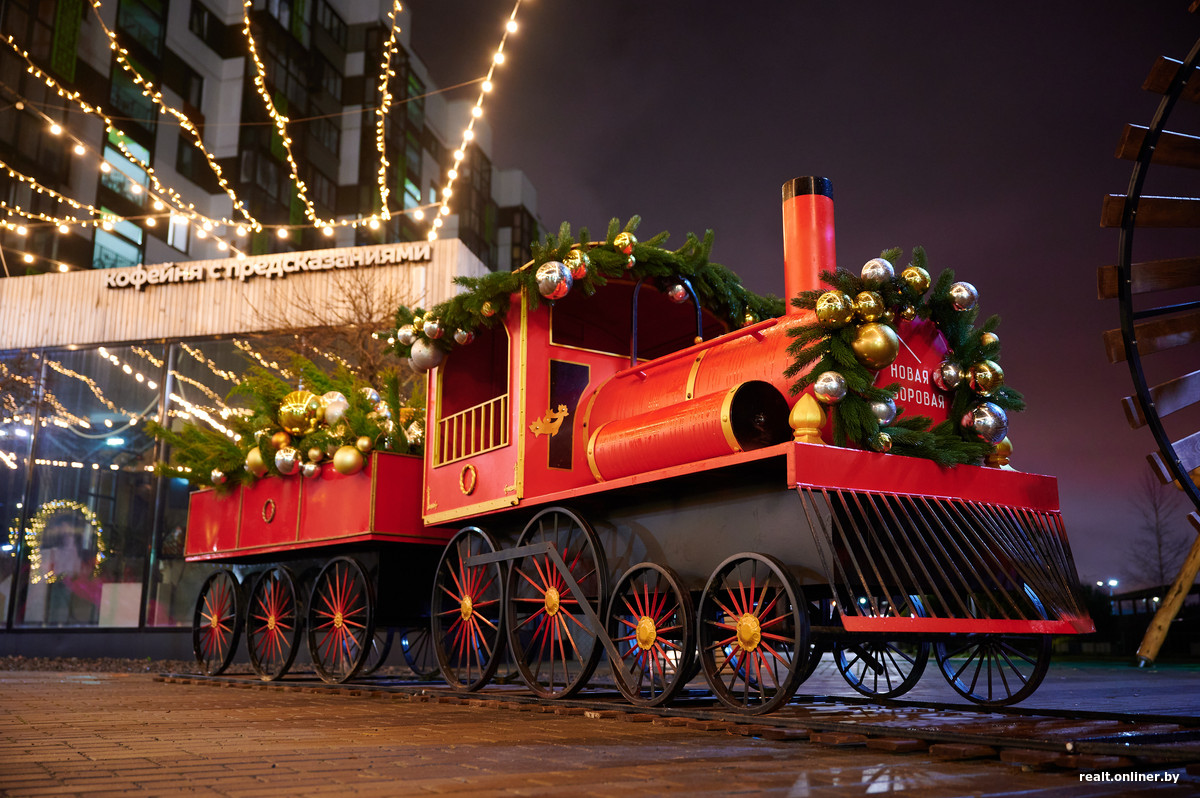 Вблизи кофейни с предсказаниями появился сказочный паровоз. Вместе с вагоном его нарядили в новогоднее: повсюду зеленые ветки и елочные шары. Волшебный поезд может стать отличным местом для фотосессий.