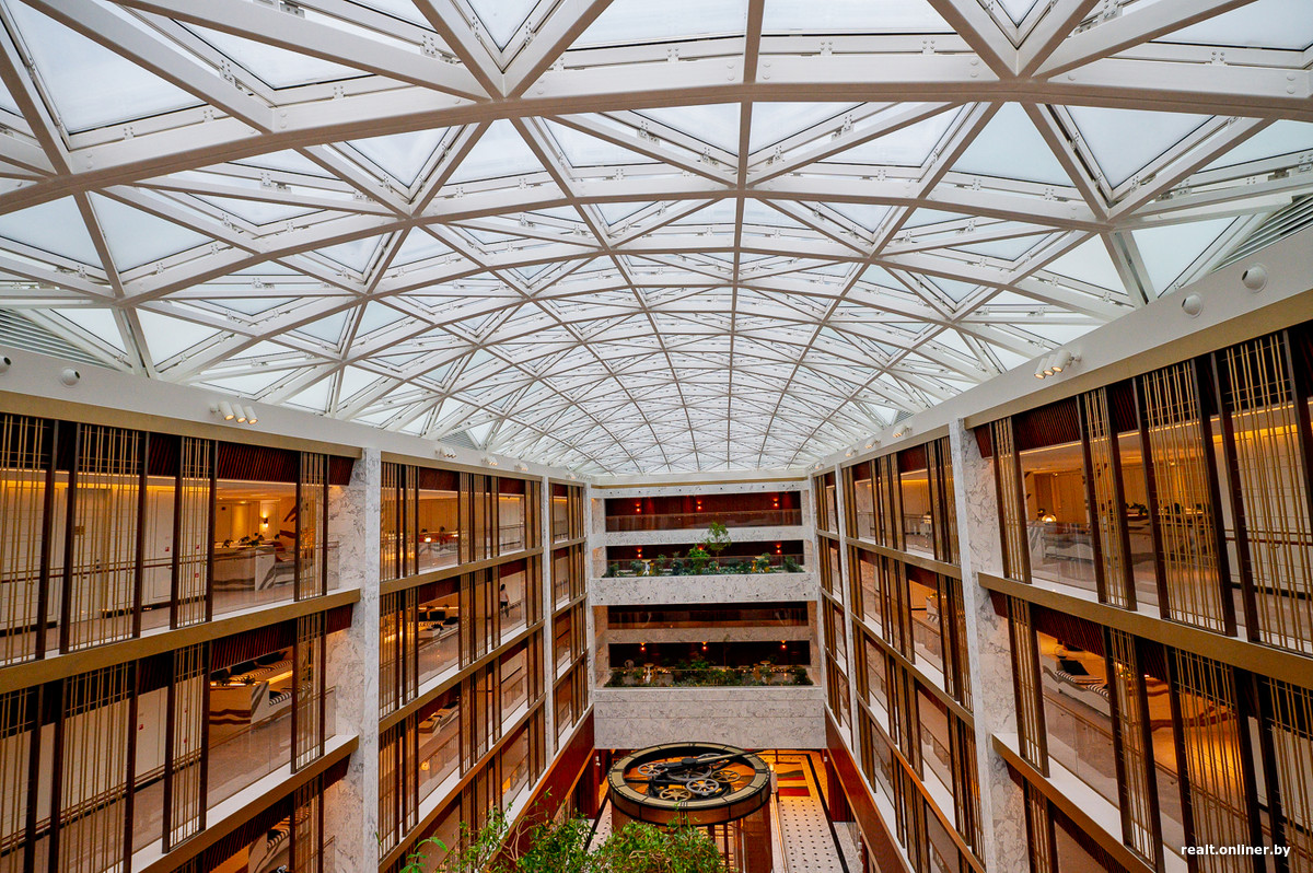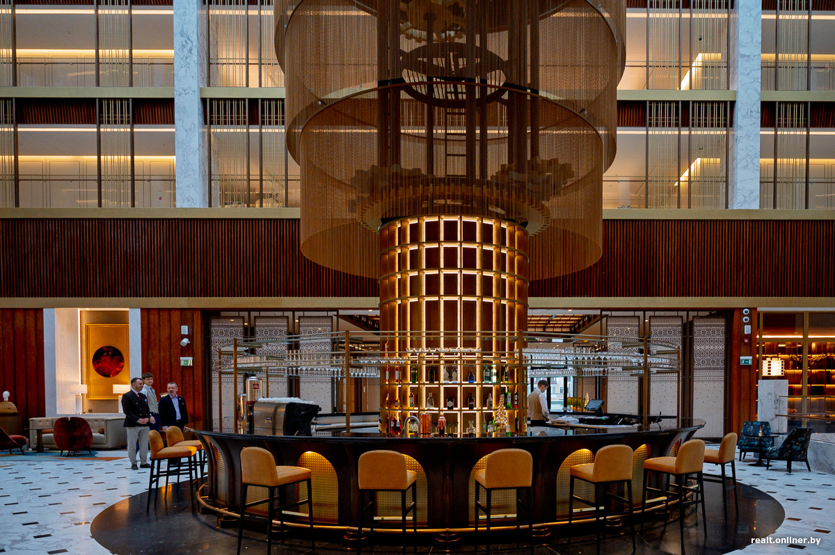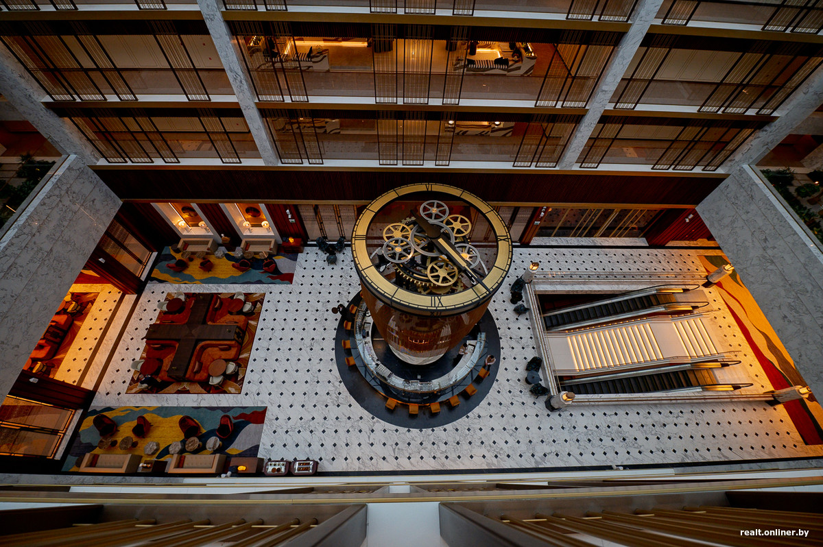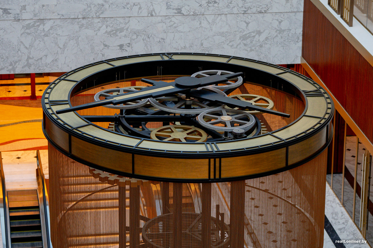 Самый знаковый элемент в лобби — инсталляция с часами выстой 9,5 метра в центре атриума. Дело в том, что когда-то Джон Джейкоб Астор купил часы, которые ранее были изготовлены для Всемирной колумбийской выставки 1893 года по инициативе королевы Виктории. В 1931-м бизнесмен поставил их красоваться в своем отеле в Нью-Йорке. Теперь в каждом Waldorf Astoria есть собственная вариация больших часов — такая вот дань истории. Говорят, минская интерпретация получилась самой высокой. В разработке этой конструкции принимали участие несколько стран: дизайн — из Англии, механизм — из Германии, основание — из Италии, декор — из Беларуси.