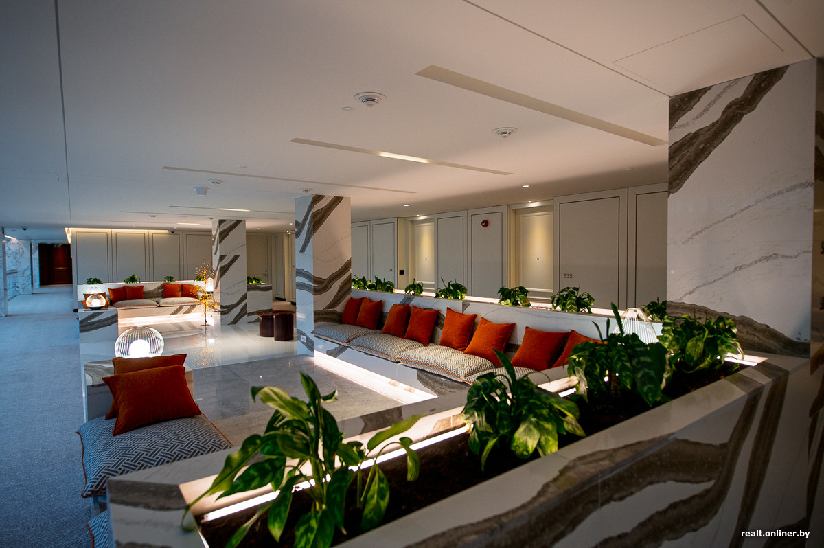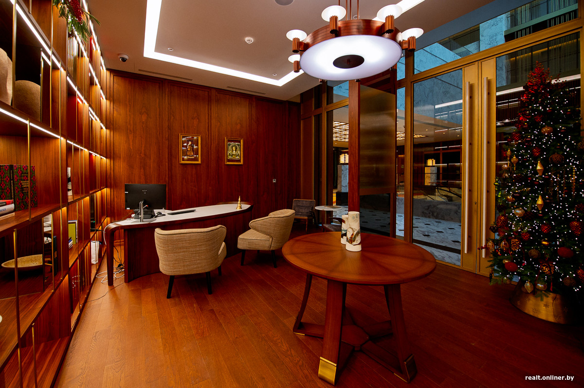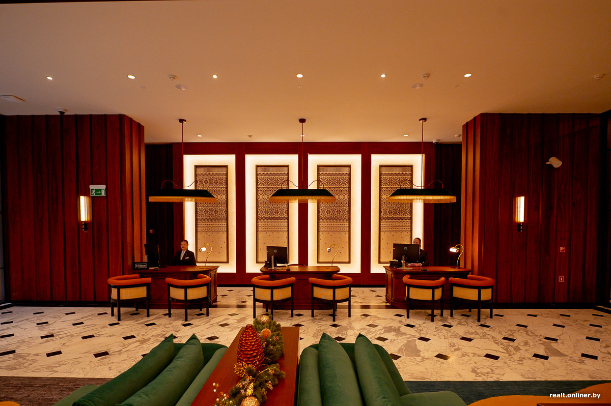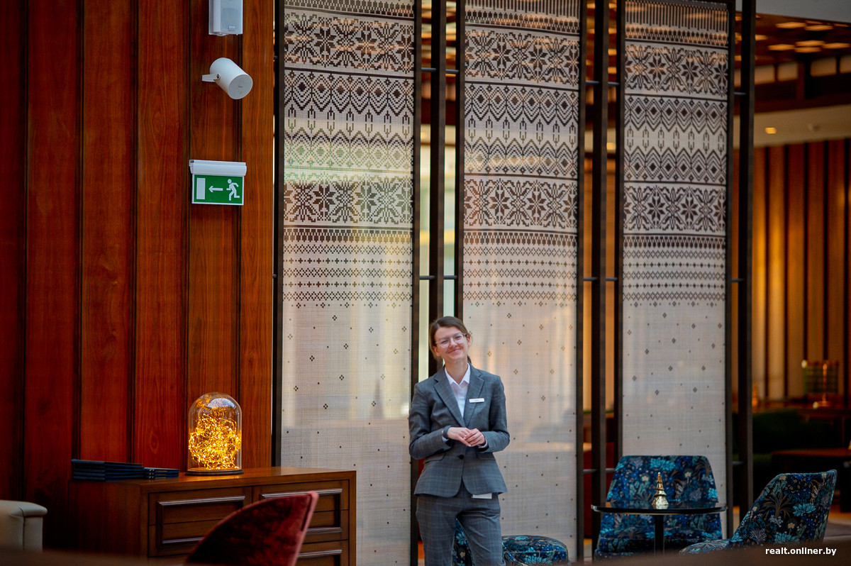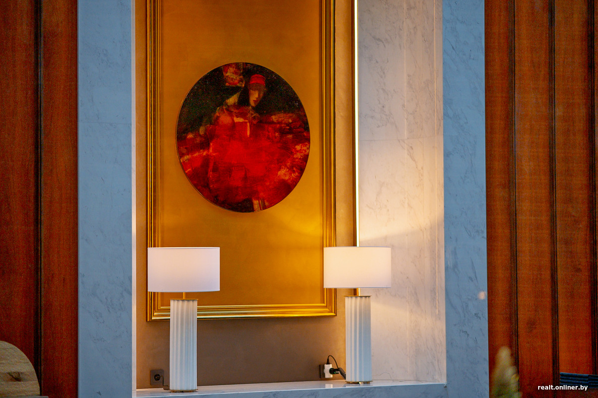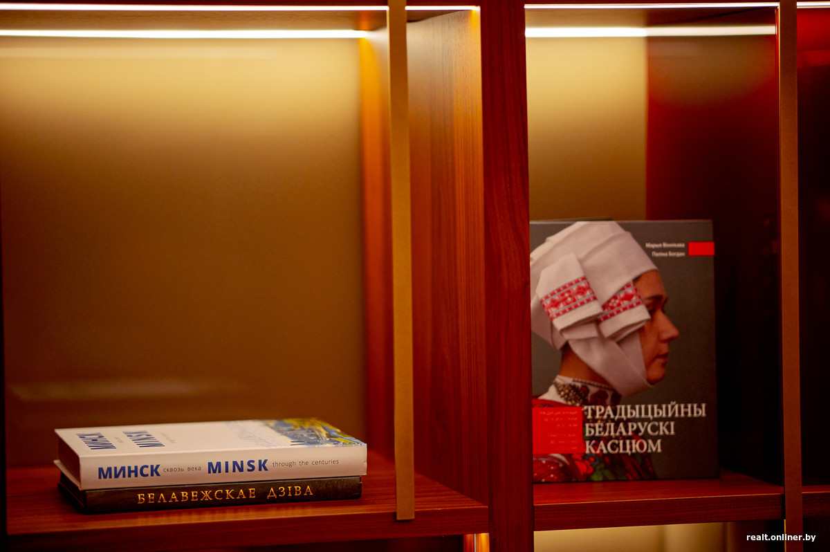Фишка, которая точно понравится белорусам, — повсеместно стоят предметы искусства, созданные местными мастерами. Перегородки в холле украшены полотном с национальным орнаментом. На полках можно увидеть белорусские книги. Картины, скульптуры повсюду — тоже дело рук местных художников. Получается, роскошь тут смешивается с искусством, и это продуманный ход: