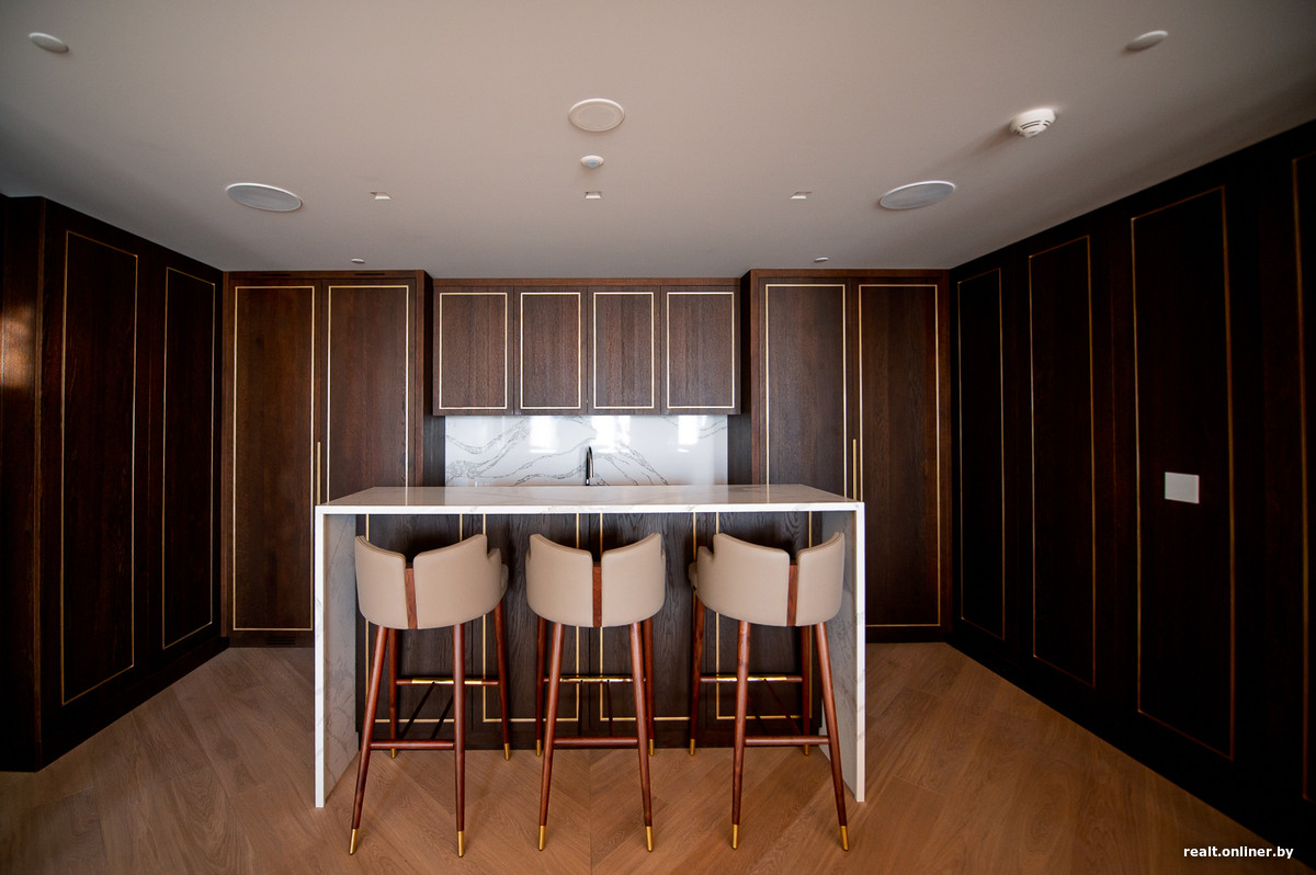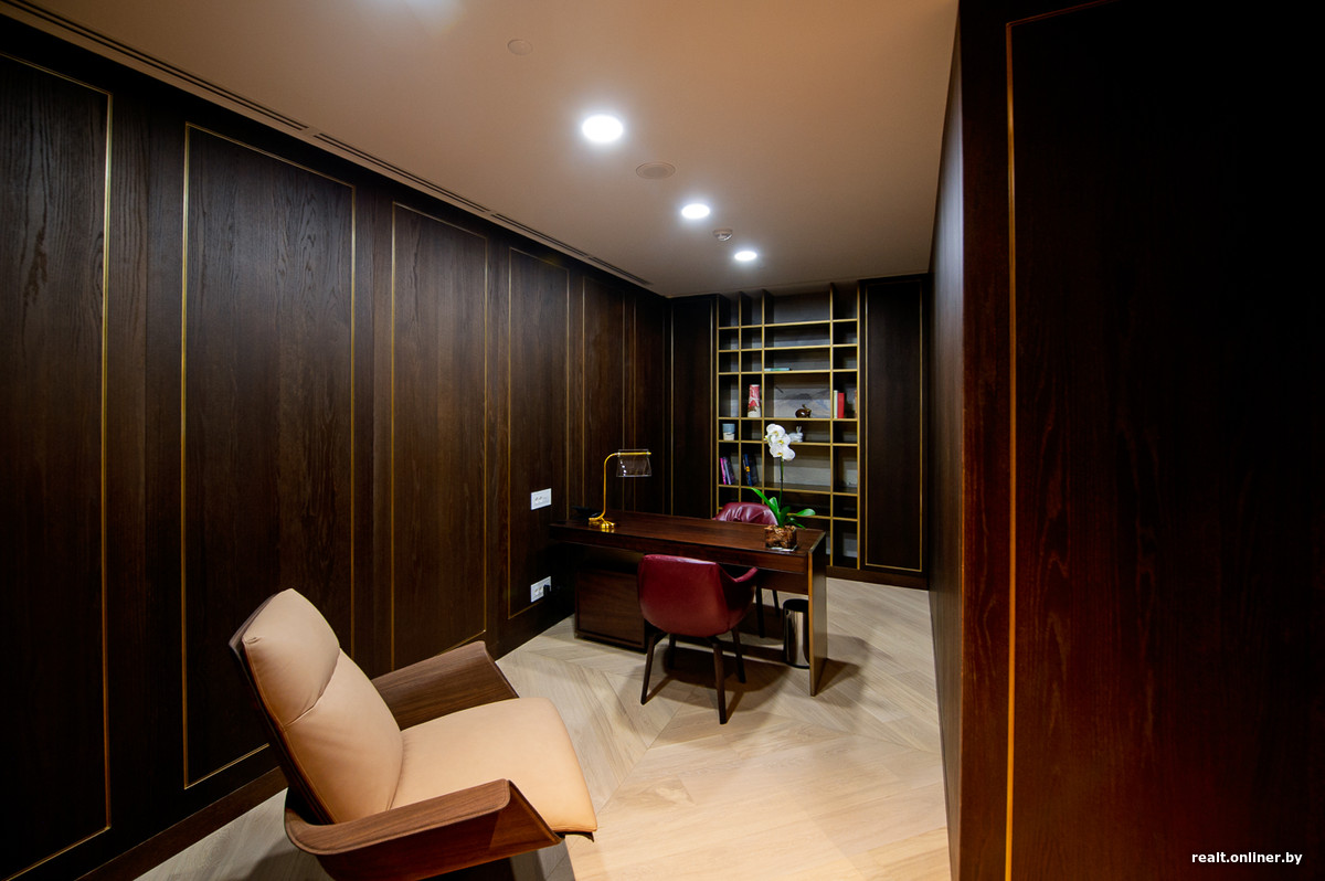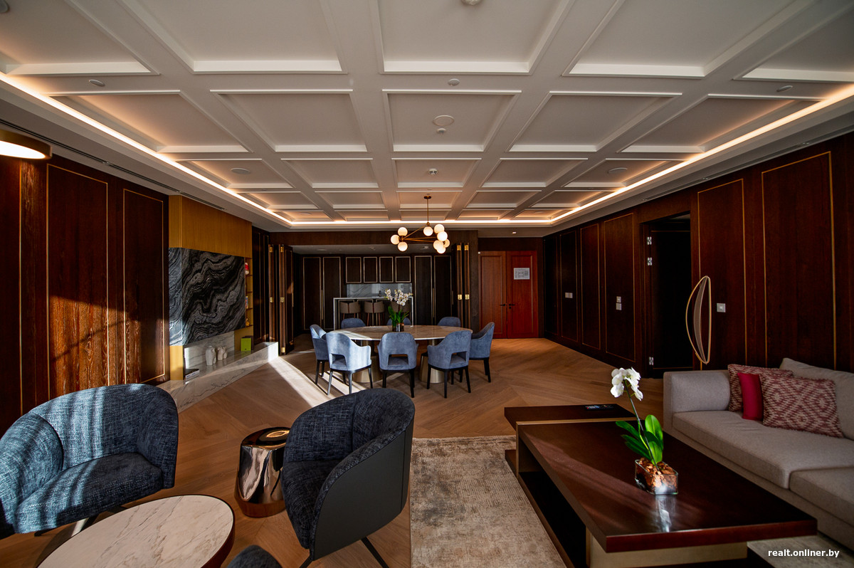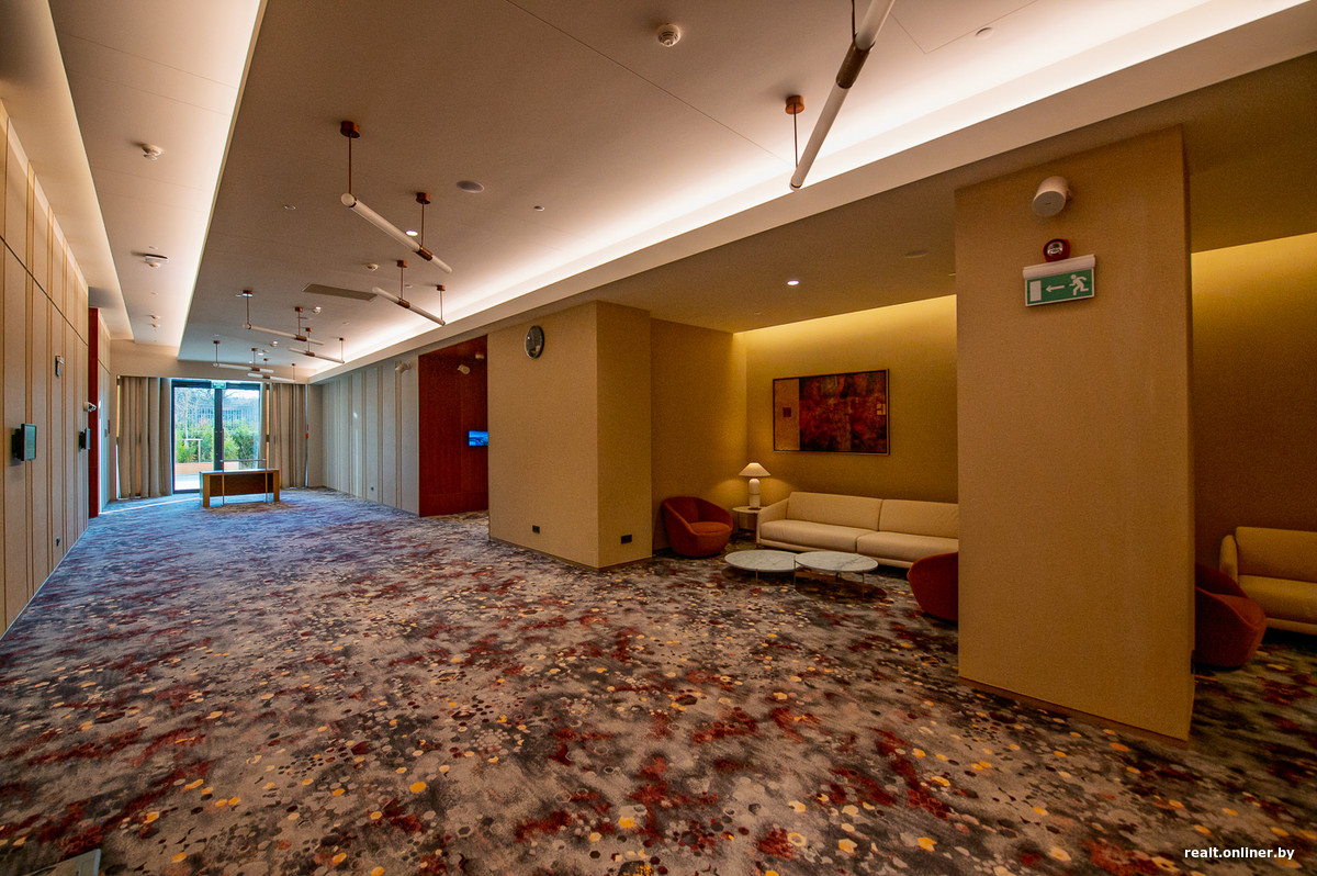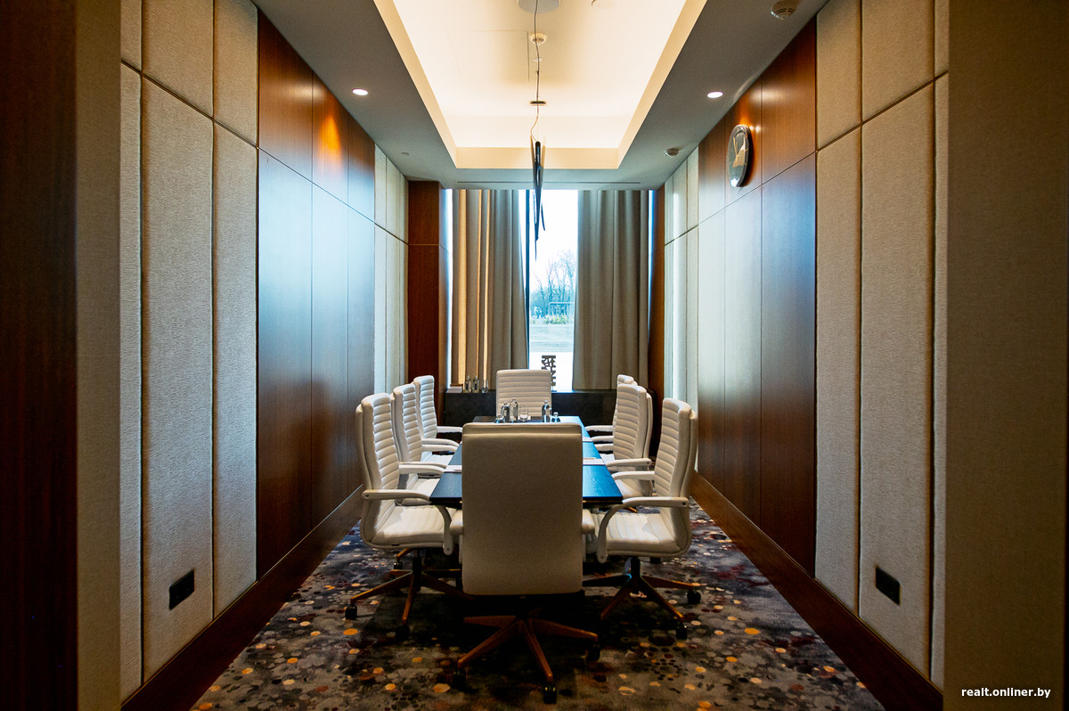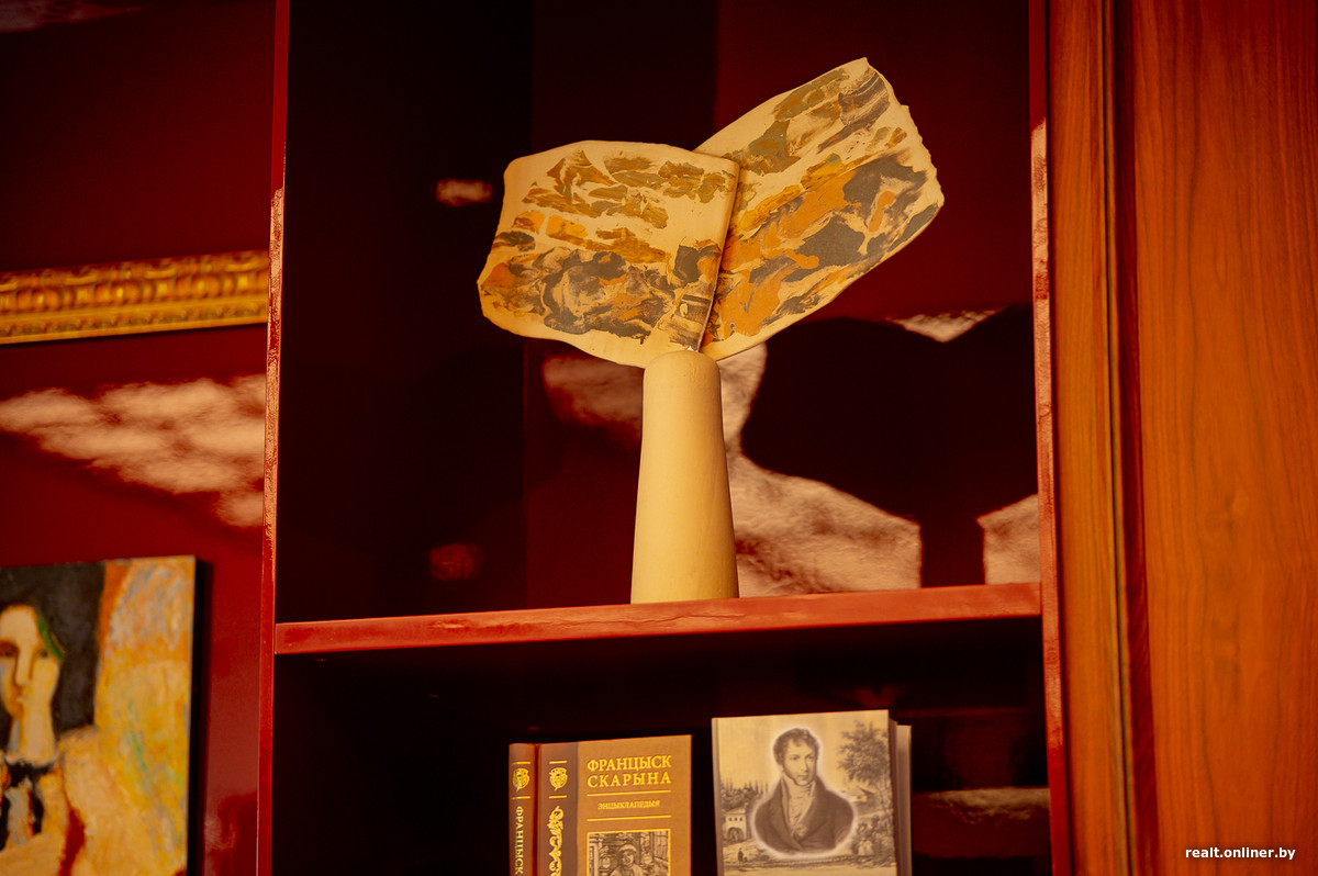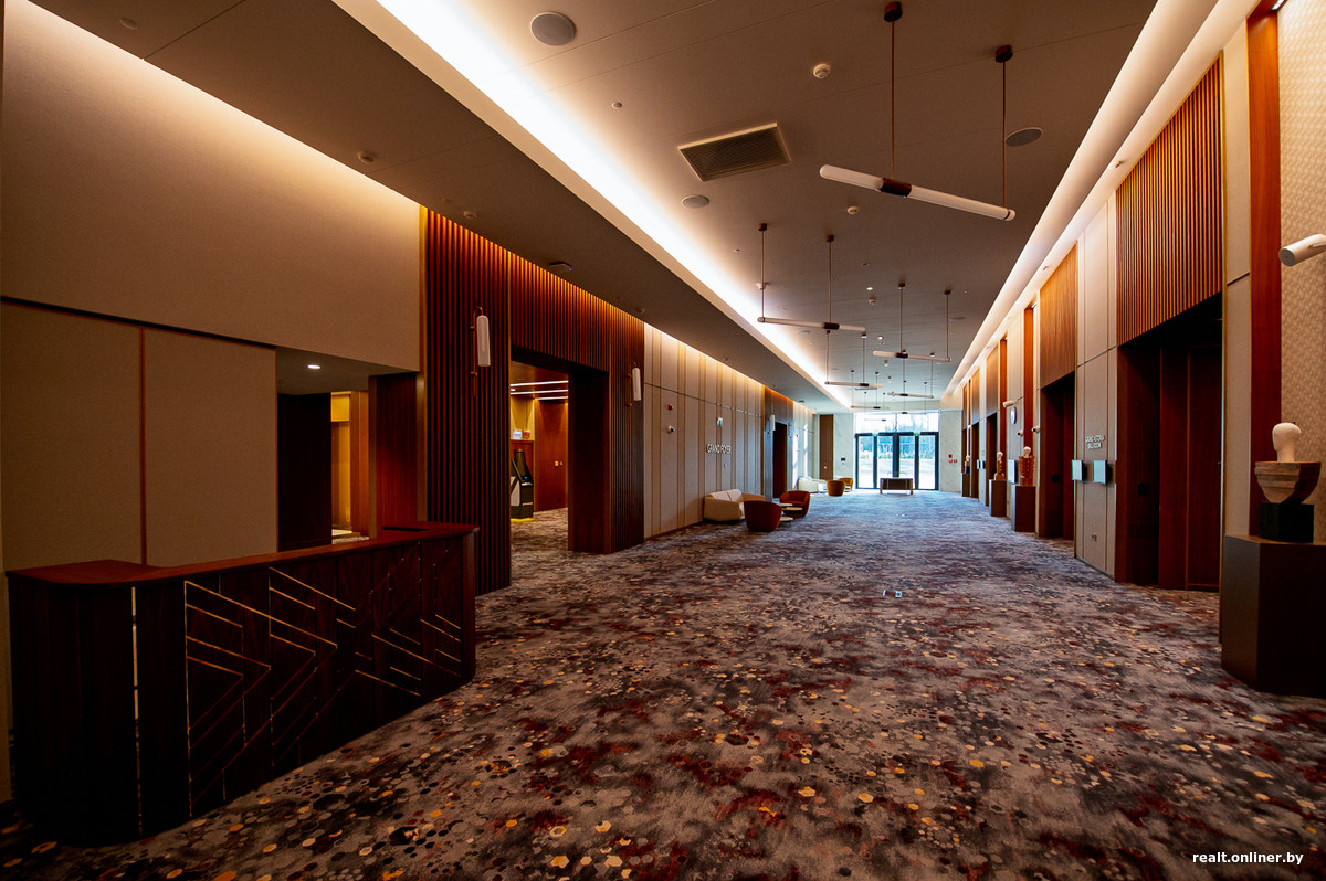Фишка, которая точно понравится белорусам, — повсеместно стоят предметы искусства, созданные местными мастерами. Перегородки в холле украшены полотном с национальным орнаментом. На полках можно увидеть белорусские книги. Картины, скульптуры повсюду — тоже дело рук местных художников. Получается, роскошь тут смешивается с искусством, и это продуманный ход: