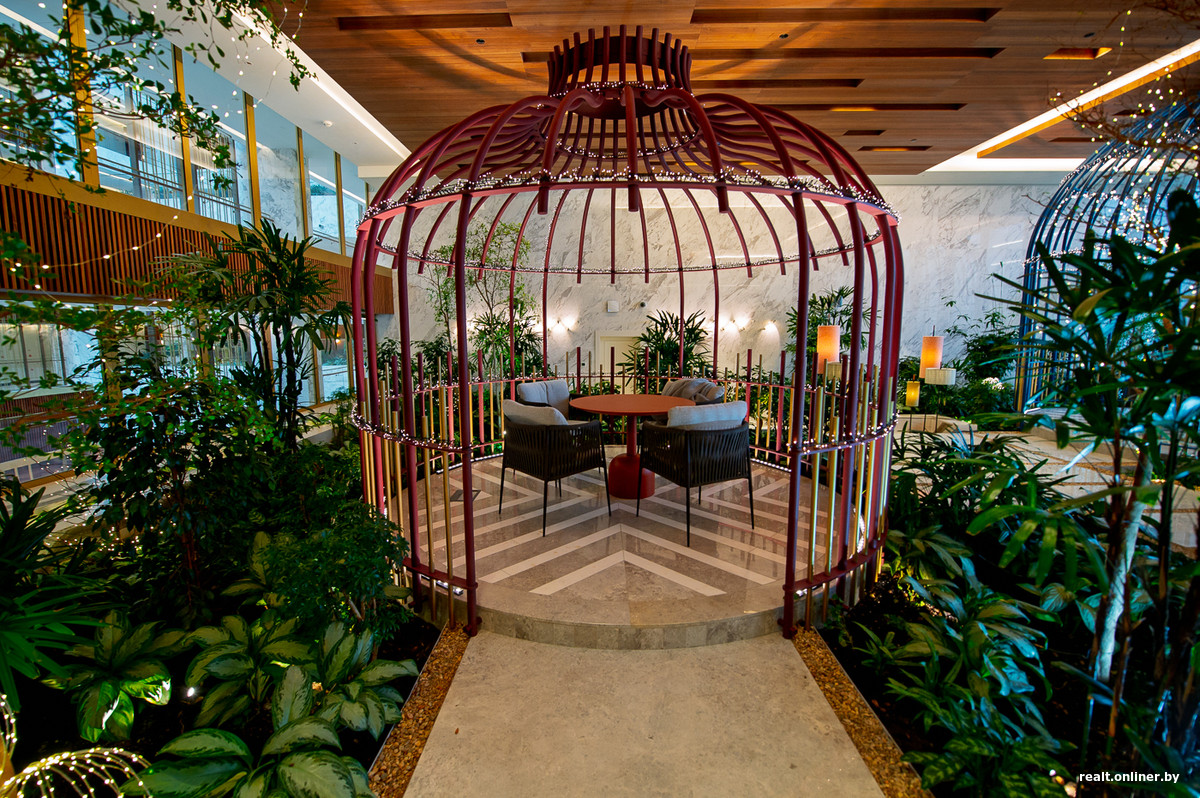 Коридоры с номерами прерываются зонами отдыха. А на одном из этажей есть полноценный зимний сад с беседками, напоминающими павлиньи клетки. Гости здесь могут отдохнуть, также заказать чайную церемонию, которая является фишкой Waldorf Astoria.