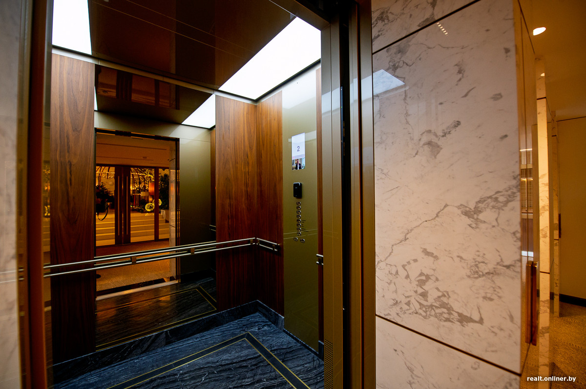 Заходим в лифт и поднимаемся изучать номера. Лифты тут тоже вторят общей стилистике — пафосная отделка снаружи и золото внутри. Обратите внимание на производителя — недоступный нынче из-за санкций Otis. К слову, мебель, декор, посуда и прочая начинка в отеле тоже импортные — из Италии, Португалии, Испании, Германии, Великобритании и Индии.